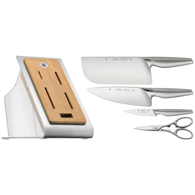 Azijska geometrija rezila: Noži so oblikovani po vzoru tradicionalnih azijskih nožev (vključuje vsestranski nož tipa Santoku in specializirane sekire za zelenjavo/meso).