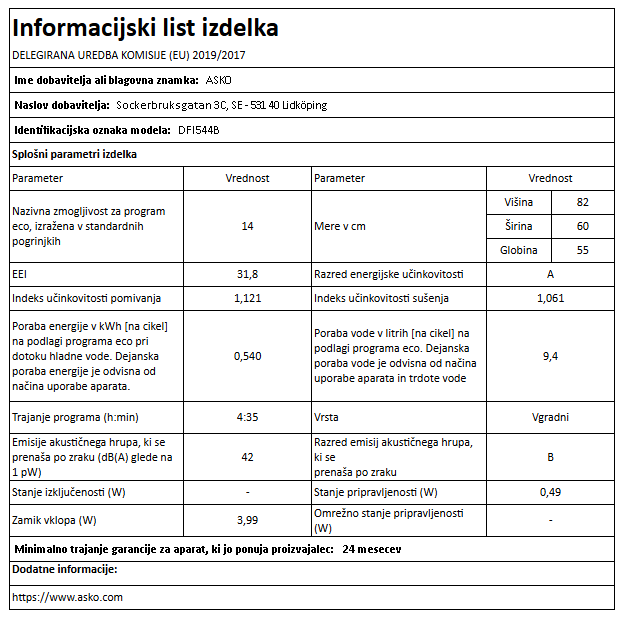 DFI544B popolnoma vgradni pomivalni stroj ASKO