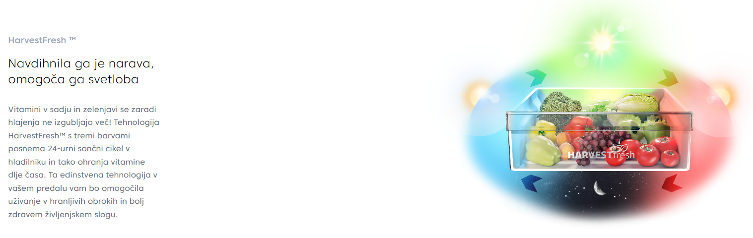 Edinstvena HarvestFresh™ tehnologija, navdihnjena z naravo, je osupljiva lastnost tega hladilnika-zamrzovalnika. Z izvajanjem 24-urnega sončnega cikla v notranjosti hladilnika, posnema naravne pogoje in tako ohranja vitamine v sadju in zelenjavi dlje časa. To pomeni, da lahko uživate v hranljivih obrokih in podaljšate svežino vaših živil, kar prispeva k bolj zdravemu načinu življenja.