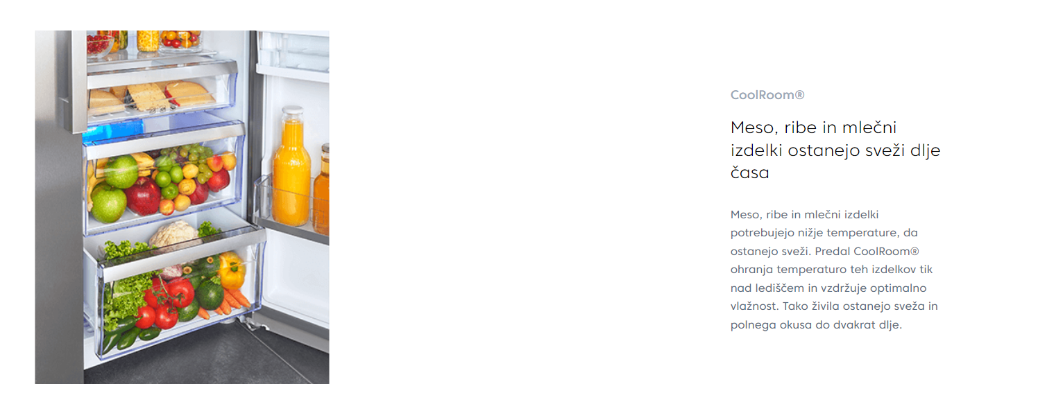 CoolRoom® predal je namenjen ohranjanju svežine mesa, rib in mlečnih izdelkov. Z vzdrževanjem nižjih temperatur tik nad lediščem ter optimalne vlažnosti, živila ostanejo sveža in polnega okusa do dvakrat dlje, kar pripomore k zmanjšanju odpadkov in prihranku denarja.