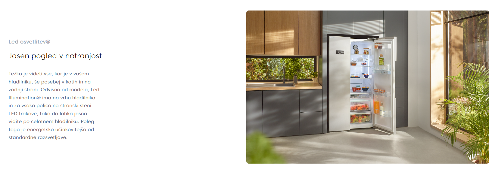 Jasen pogled v notranjost hladilnika omogoča Led Illumination®. S svojimi LED trakovi na vrhu hladilnika in na vsaki polici na stranski steni, je celotna notranjost enakomerno osvetljena, kar olajša iskanje in dostopanje do vaših živil. Poleg tega je ta tehnologija energetsko učinkovitejša od standardne razsvetljave, kar prispeva k zmanjšanju porabe energije.