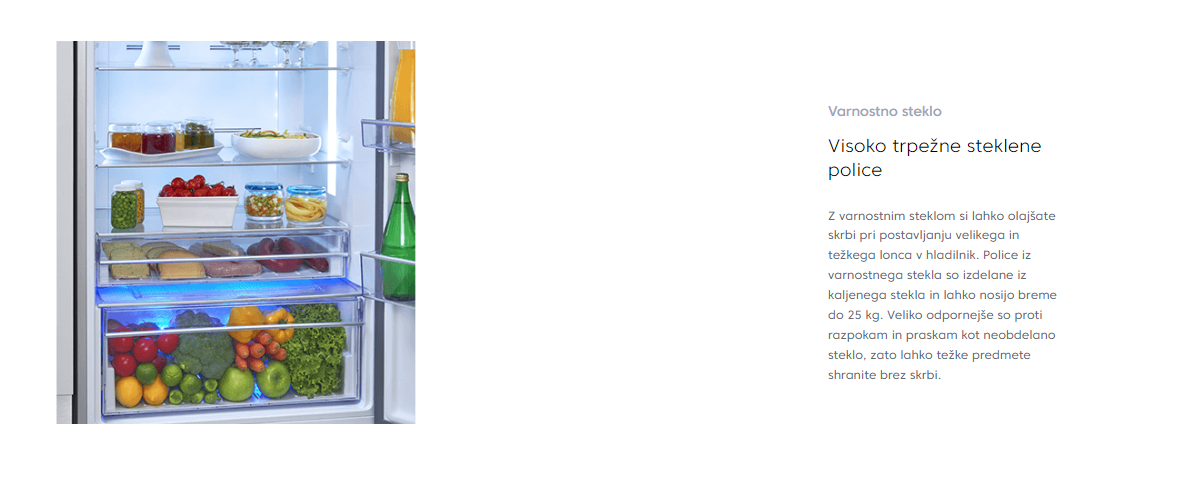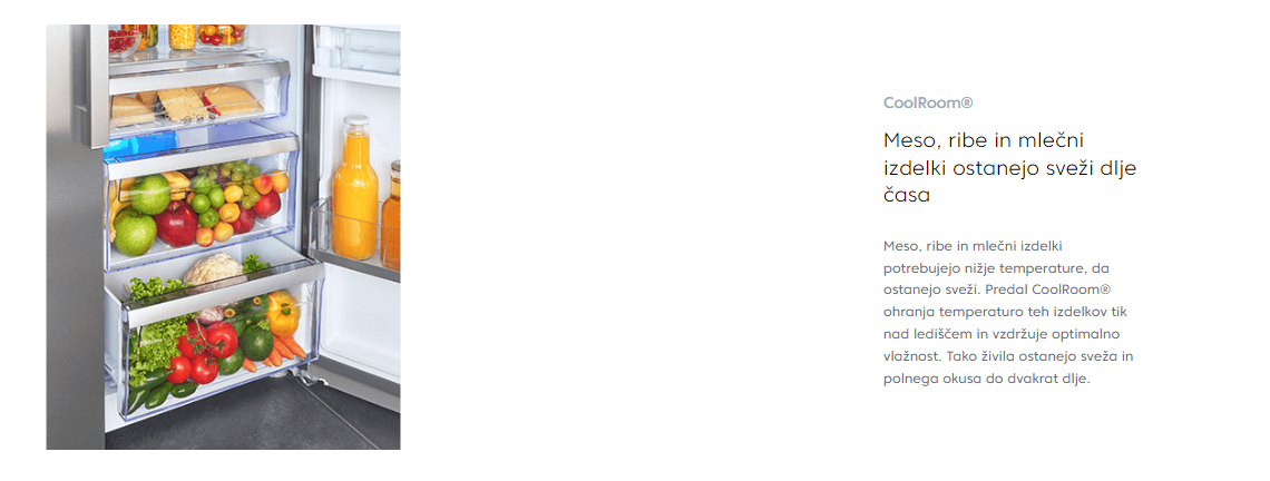 Za optimalno organizacijo hladilnega dela poskrbijo dva predala, CoolRoom funkcija in štiri vrata za shranjevanje. Frost Free Freshfood Storage Compartment (EP) zagotavlja, da se hrana ne zamrzne nepričakovano.