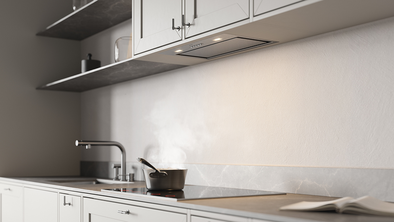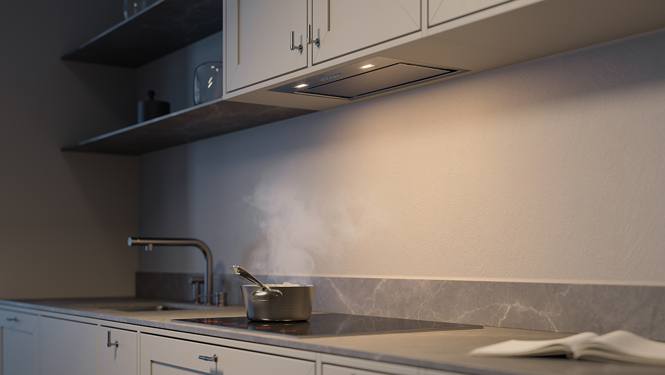 Skrito filtrirno območje prispeva k prefinjenemu videzu, ki se popolnoma zlije z moderno kuhinjo. Zatemnitvena LED osvetlitev omogoča izbiro med popolno delovno svetlobo in prijetno ambientalno osvetlitvijo za sproščene večere.