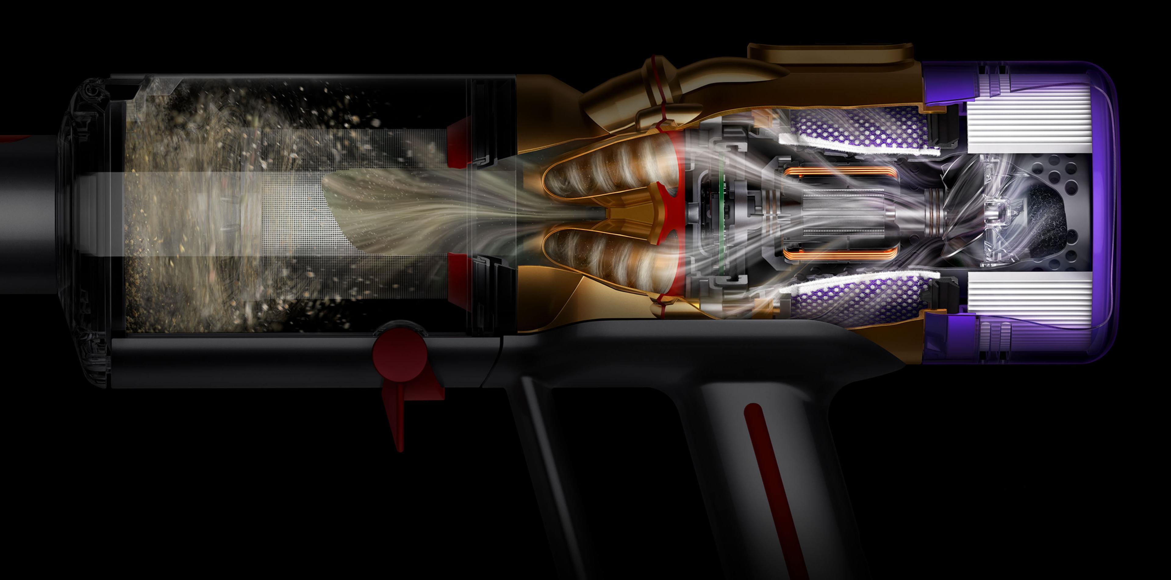 Osem ciklonov ustvarja silo vse do 96.000g in odvrže prah v posodo in ne v filter – tako ni izgub v moči sesanja.
