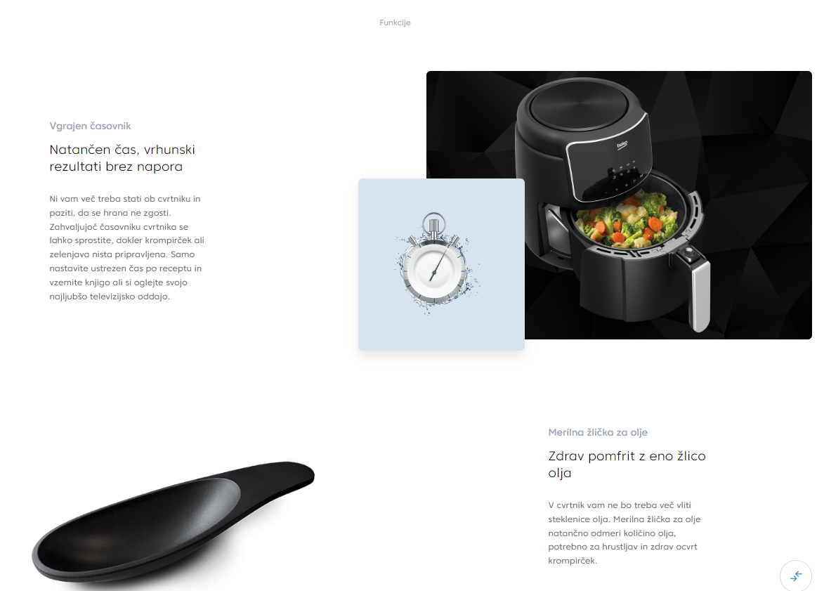 Inovativni Drawer System (sistem predala) omogoča preprosto polnjenje in izpraznjenje hrane ter prispeva k enostavni uporabi. Cvrtnik vključuje tudi pralno košaro za kuhanje in 8 avtomatskih programov kuhanja, ki olajšajo pripravo različnih jedi.