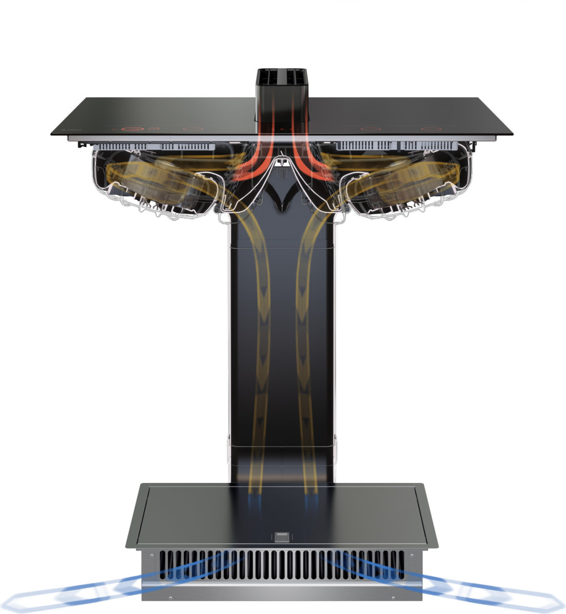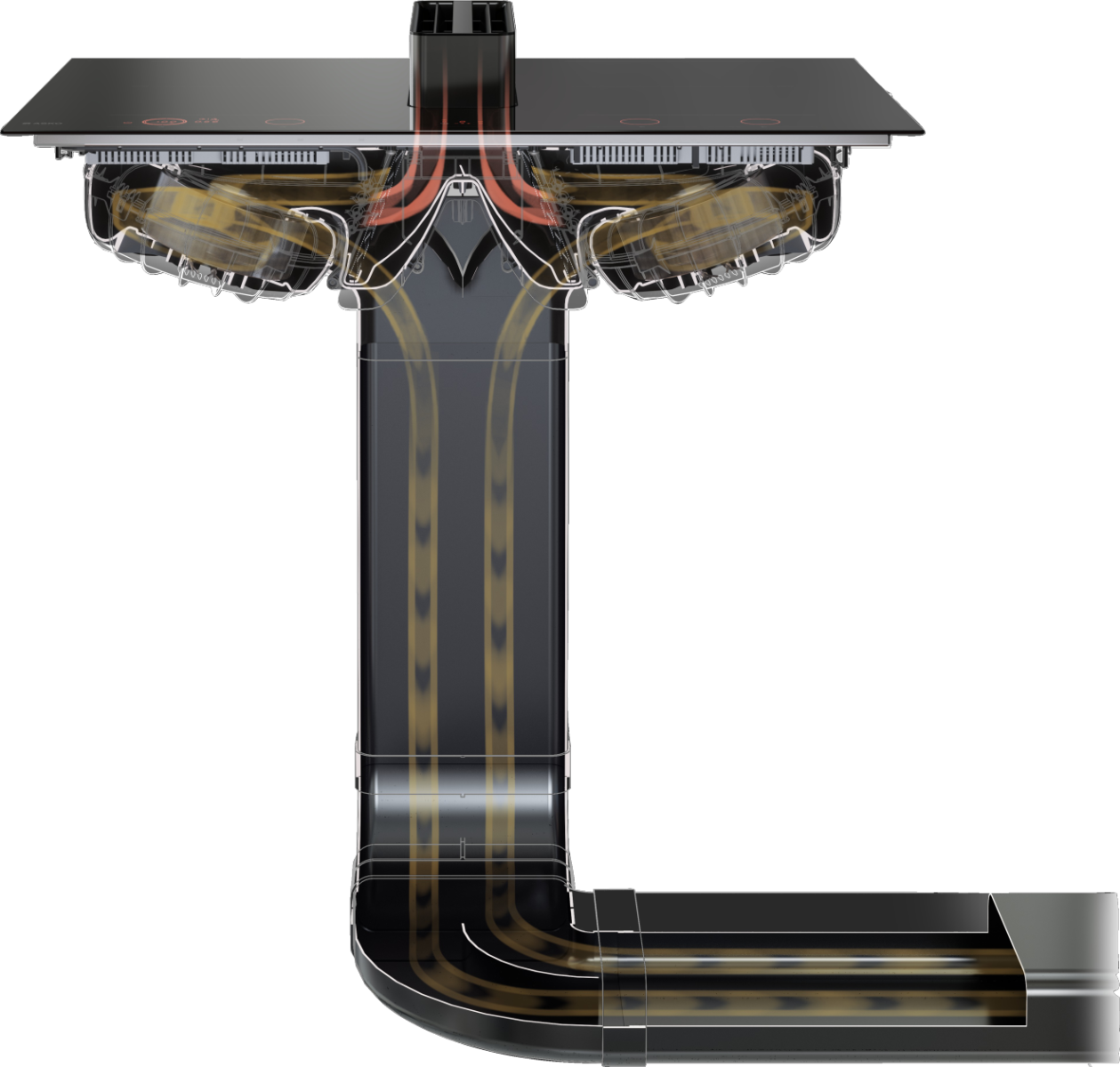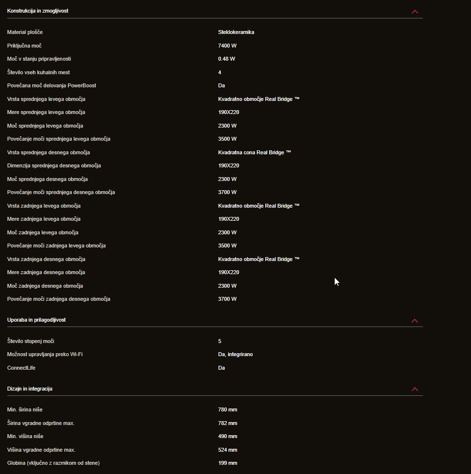 Indukcijska plošča z napo je napreden kuhinjski aparat, ki ima štiri kuhalna območja s steklokeramično površino. Plošča ima priključno moč 7400 W in porabo v stanju pripravljenosti 0,48 W, kar jo uvršča v energijski razred A. Poleg tega ima tudi funkcijo PowerBoost, ki omogoča povečano moč delovanja. Vsako kuhalno območje ima kvadratno območje Real Bridge™, kar pomeni, da se območja lahko združujejo v eno veliko kuhalno površino. Sprednje levo in desno območje imata dimenzije 190x220 mm, moč 2300 W in povečano moč 3500 W oz. 3700 W. Zadnji levi in desni kuhalni območji imata enake dimenzije in moč kot sprednji levi in desni območji ter enako povečano moč delovanja.