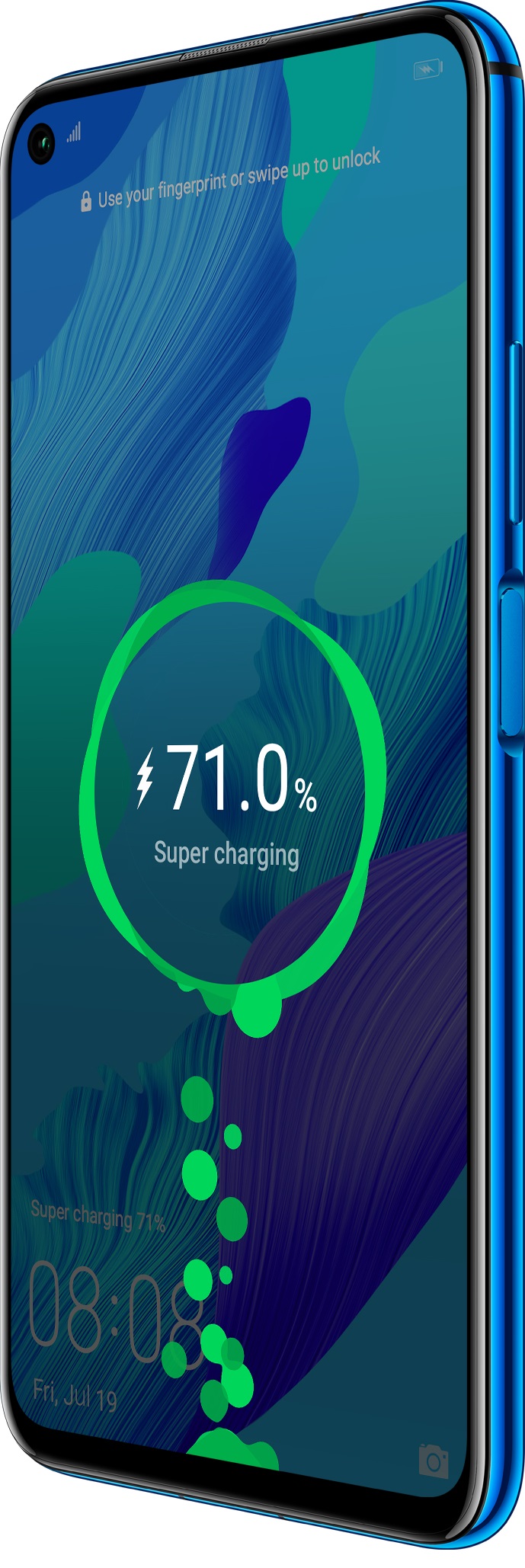 Počasno polnjenje upočasni vaše življenje. Posebno med intenzivno rabo. HUAWEI nova 5T s 3750 mAh2 veliko baterijo se ponaša s hitrim polnjenjem pri 22,5 W s tehnologijo hitrega polnjenja HUAWEI SuperCharge. Napolnite baterijo do 50 % v zgolj 30 minutah
