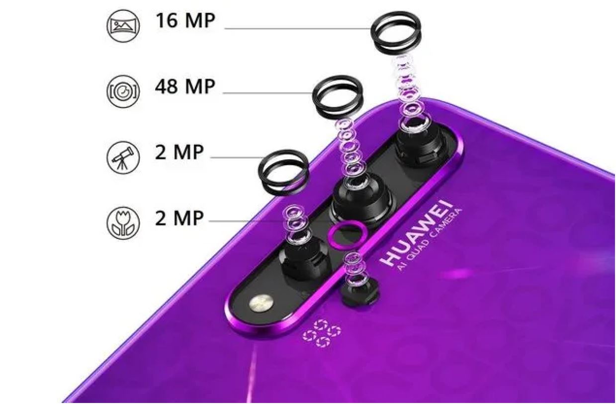 Štiri zadnje kamere, s podporo umetne inteligence na HUAWEI nova 5T, za izjemne fotografije v visoki ločljivosti, ultra širokokotne in makro ter bokeh fotografije.