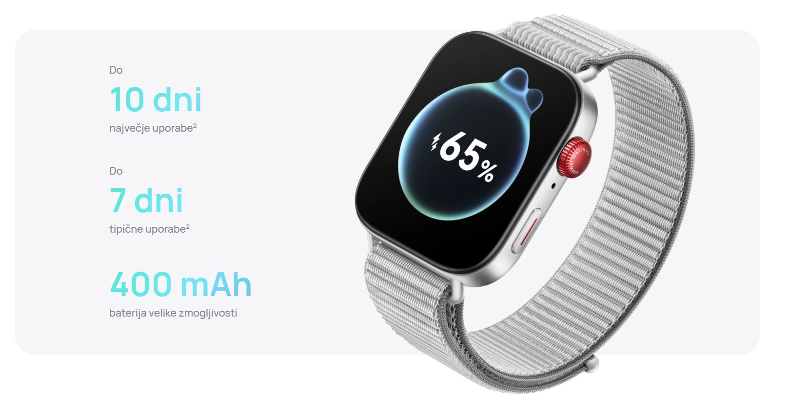 Avtonomija baterije: 10 dni avtonomije baterije ob najdaljši možni uporabi, 7 dni avtonomije baterije ob normalni uporabi, 4 dni avtonomije baterije z omogočenim vedno vklopljenim zaslonom