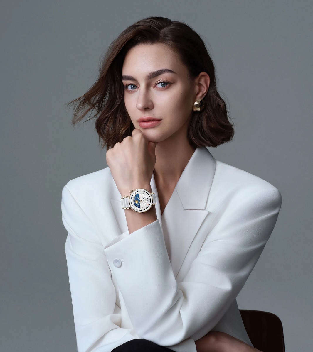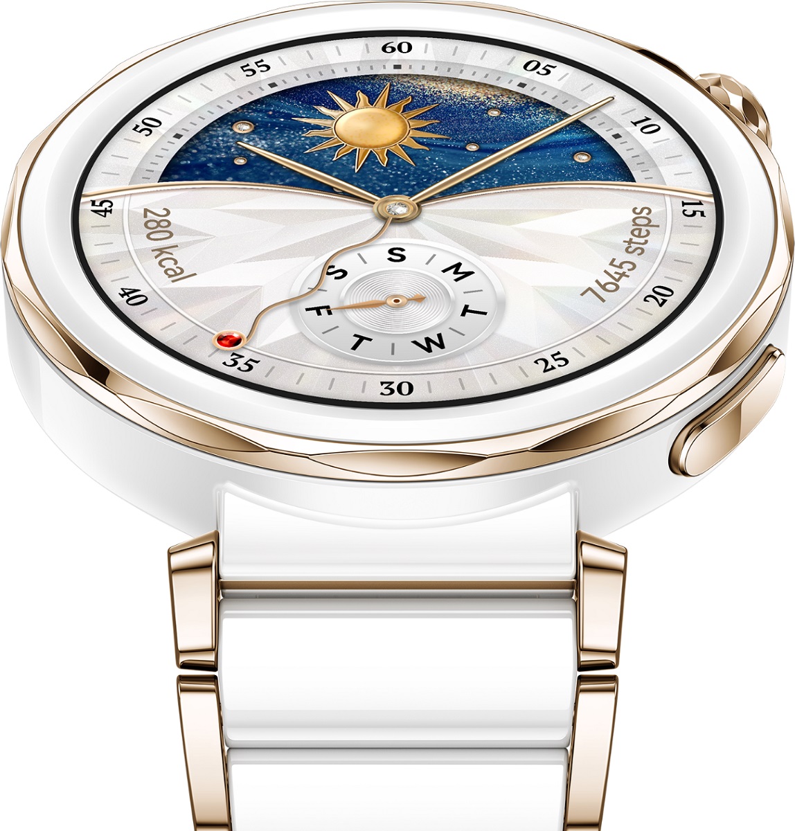 Zaslon iz safirnega stekla in okvir z zlatimi listi se lesketata pod svetlobo in zasijeta na prvi pogled.