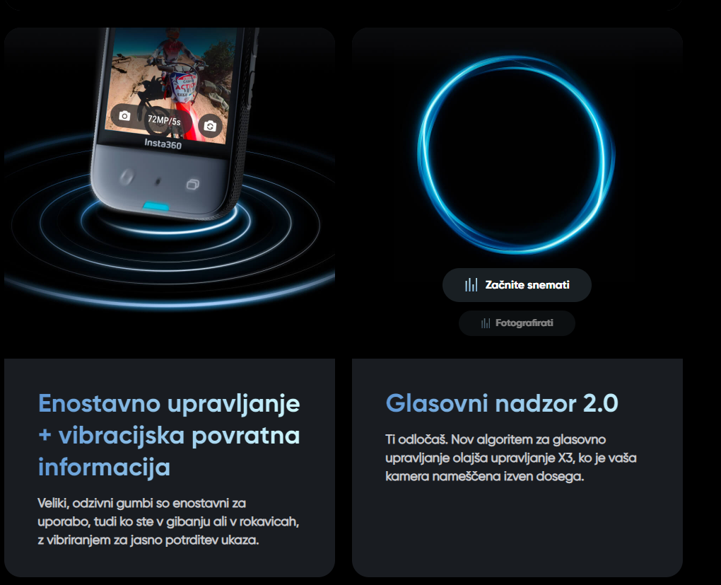 Video ločljivost: 360: 5,7K: 5760*2880@30/25/24fps 4K: 3840x1920@60/50/30/25/24fps 3K: 3008x1504@100fps Način z enim objektivom: 4K: 3840x2160@30/25/24fps 3,6K: 3584x2 60/50/30/25/24fps 2.7K: 2720x1530@60/50/30/25/24fps 1080P: 1920x1088@60/50/30/25/24fps
