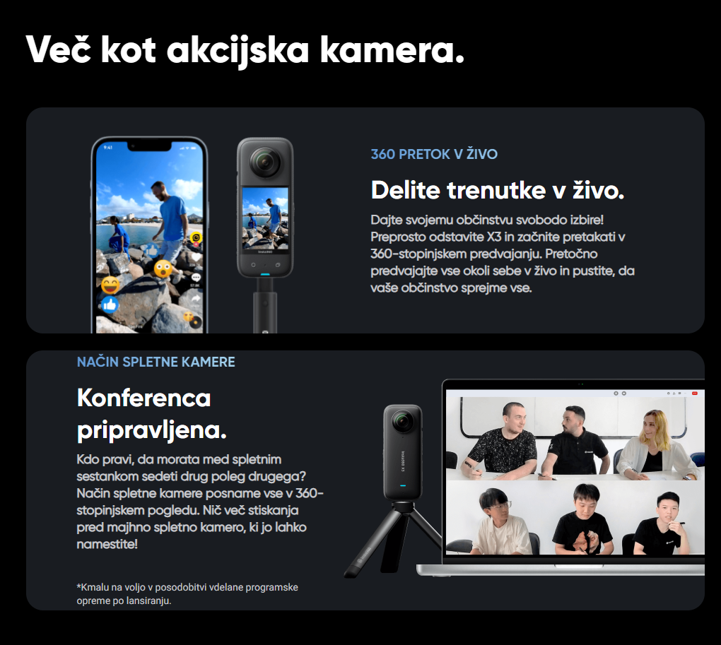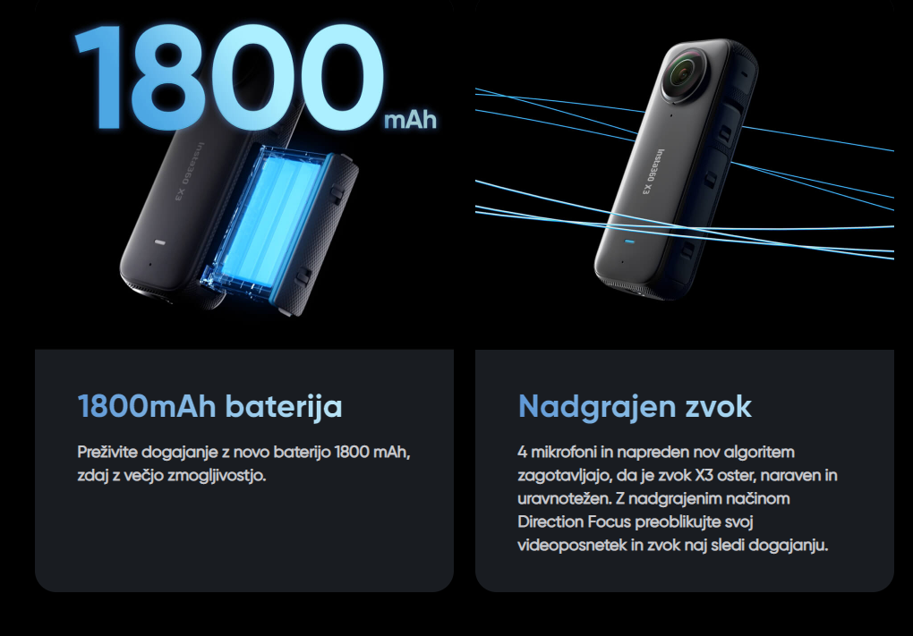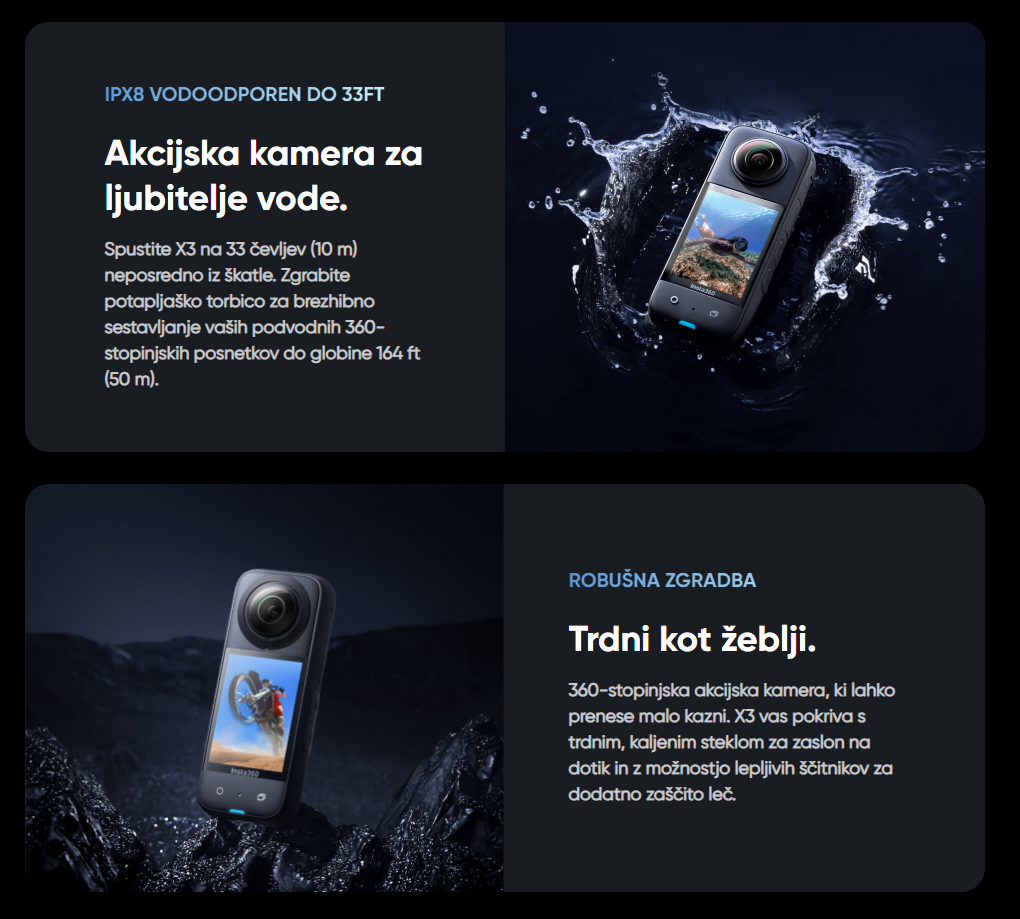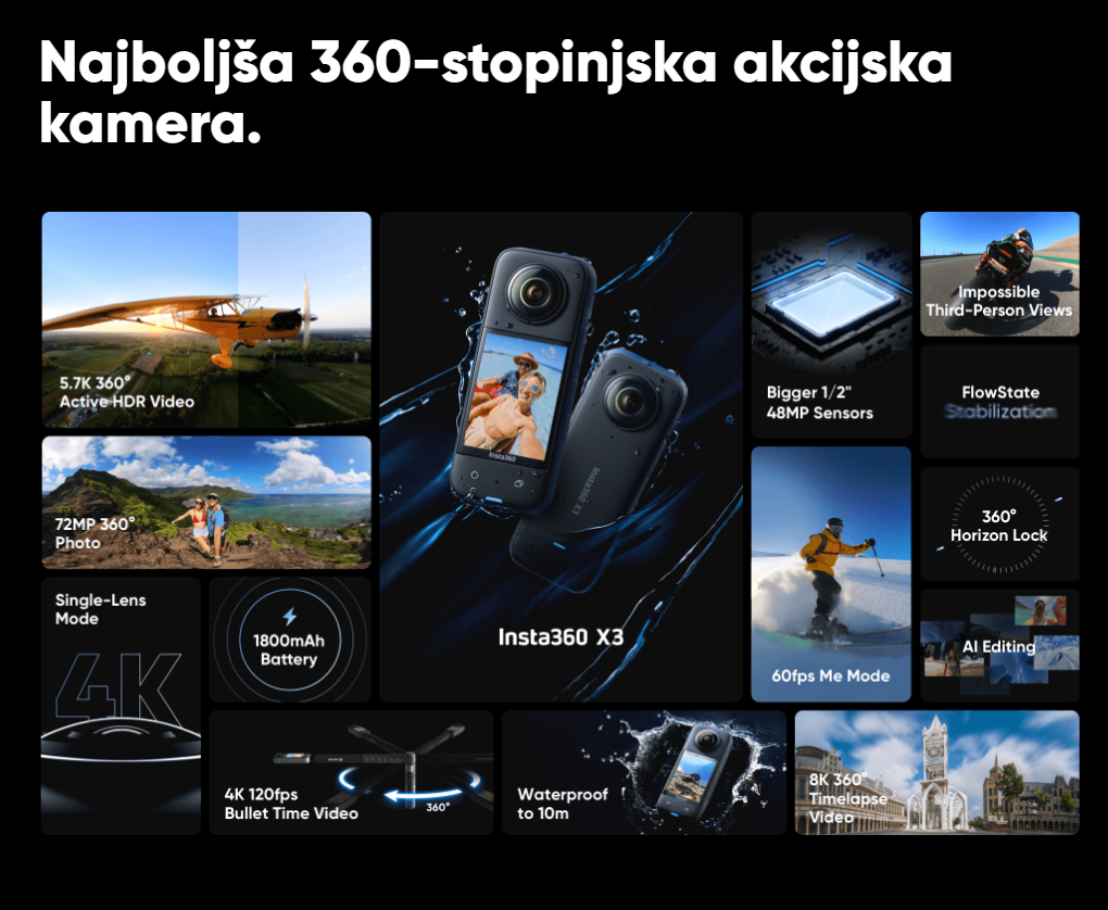 X3 zajema živahne videoposnetke 5,7K 360, tako da ne boste nikoli zamudili dogajanja. S 360-stopinjskim posnetkom na dosegu roke so ustvarjalne možnosti neskončne.