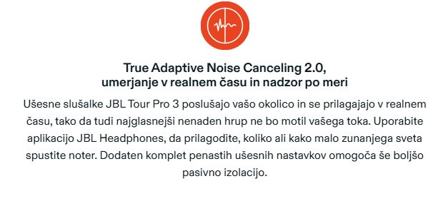 Pripravite se na doslej najpametnejše brezžične slušalke True Wireless. Slušalke JBL Tour Pro 3 so na voljo v novo zasnovanem pametnem polnilnem ohišju Smart Charging Case™ s priročnim in bolj funkcionalnim zaslonom na dotik, ki vam omogoča popoln nadzor nad izkušnjo poslušanja - medtem ko vaš telefon ostane v žepu. Brezhibno se povežite s katero koli napravo Bluetooth® in se potopite v glasbo, filme in igre z JBL Spatial 360 zvokom s sledenjem glavi. Slušalke JBL Tour Pro 3 poganja tudi legendarni Hi-Res JBL Pro Sound. Ko je čas za delo, se izklopite iz sveta s funkcijo True Adaptive Noise Cancelling v realnem času. Na letu uporabite pametno polnilno ohišje Smart Charging Case™ kot zvočni oddajnik za brezžično povezavo s sistemom v letalu (ali računalnikom) in uživajte v kinematografski zvočni izkušnji, medtem ko ste v zraku. Ali pa za pisalno mizo, preprosto povežite Smart Charging Case™ z računalnikom in poskrbite za popolno kakovost klicev.