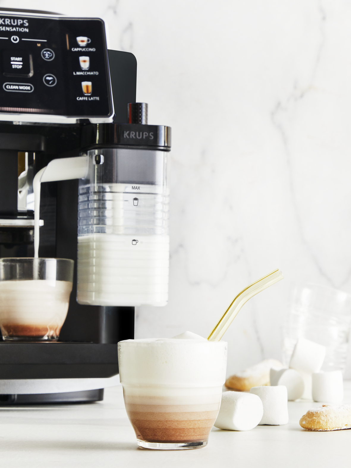 TEHNOLOGIJA MLEČNIH NAPITKOV MILK MAESTRO: Samodejni kavni aparat, opremljen z ekskluzivno tehnologijo, ki z enostavnim dotikom omogoča pripravo popolne mlečne pene — za božanske kavne in mlečne napitke z barsko kakovostjo