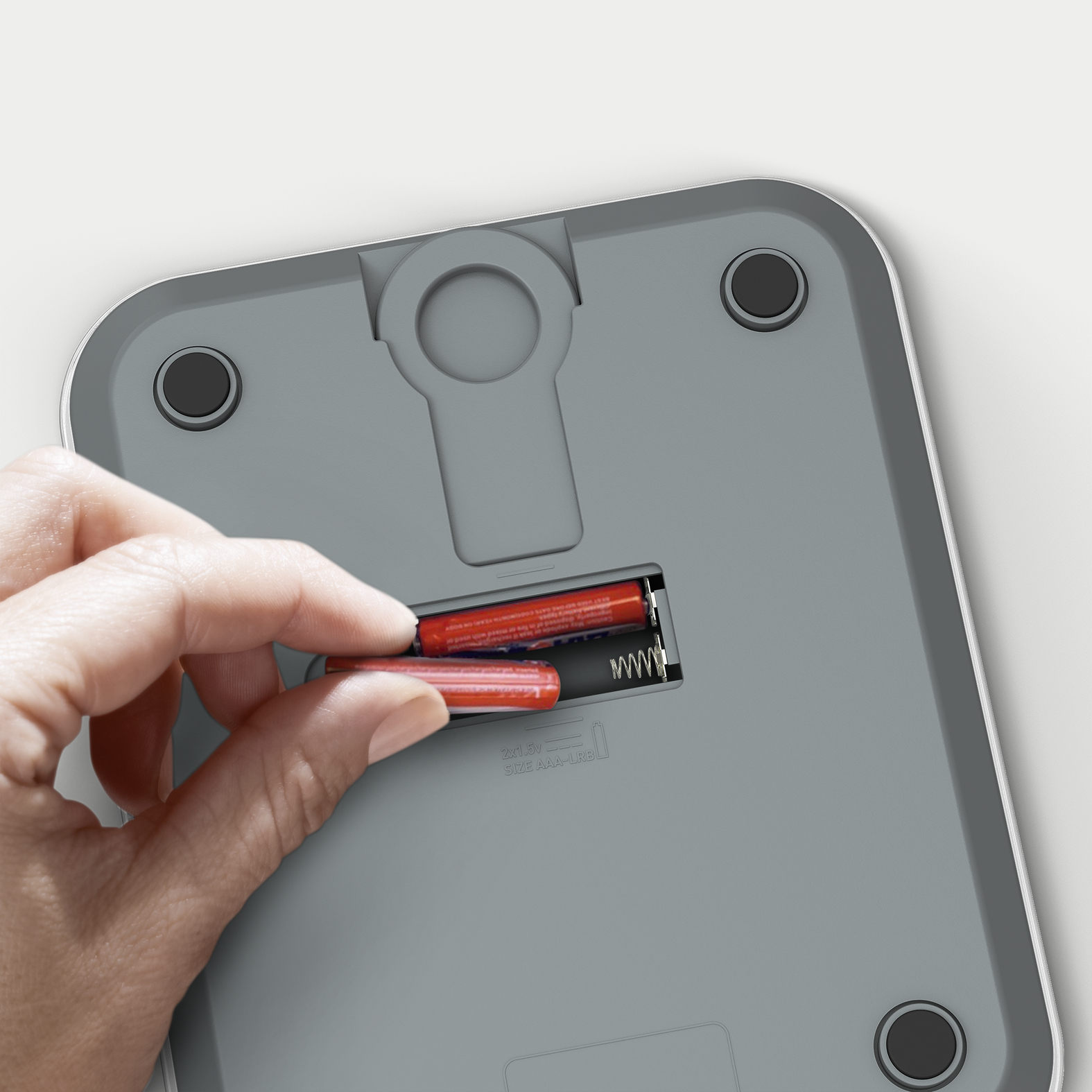 PRIPRAVLJENA ZA UPORABO: Priloženi sta 2 AAA bateriji, da lahko tehtnico začnete uporabljati takoj