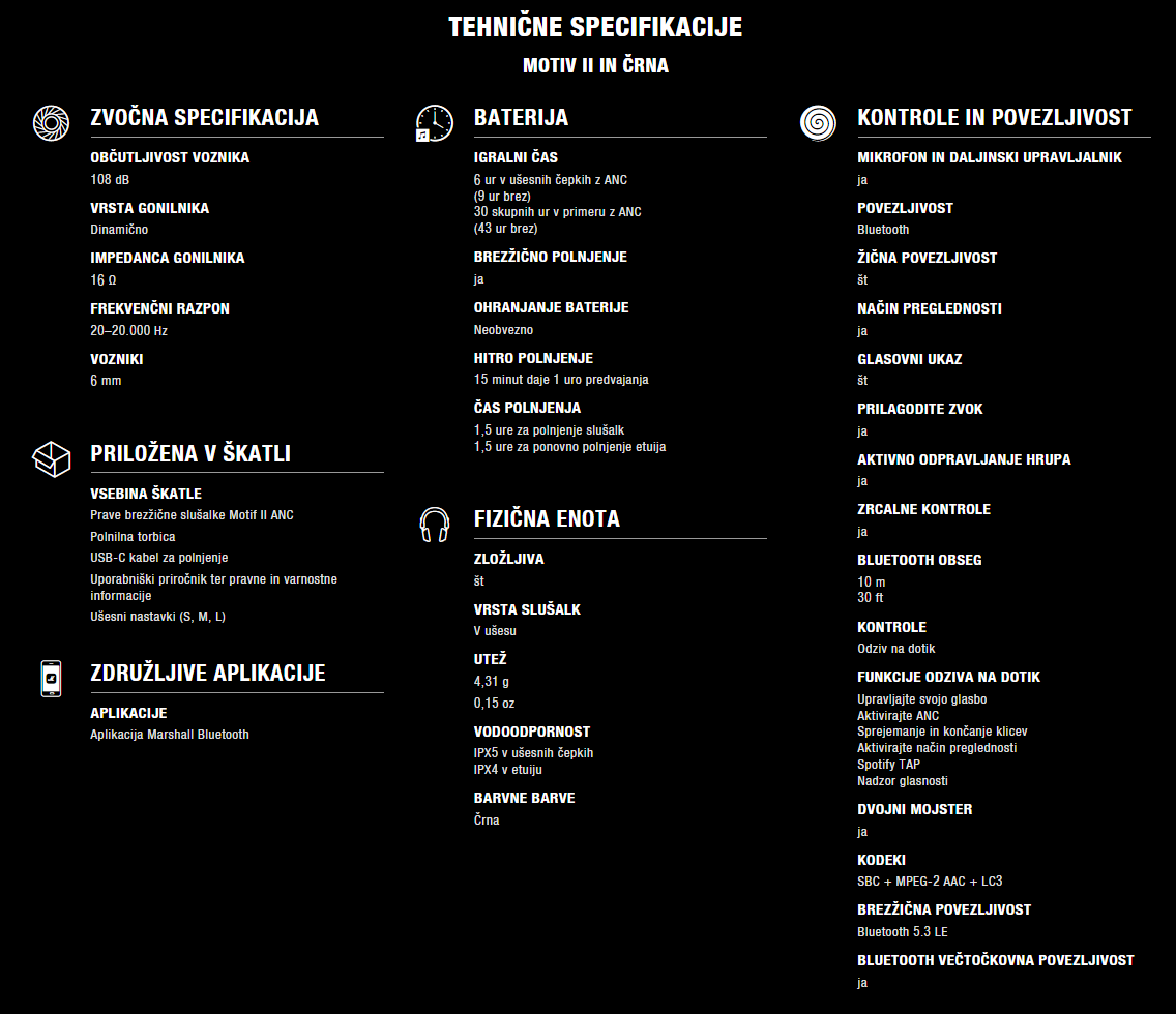 Ne pustite odlične glasbe za seboj. Z Motif II ANC lahko značilni zvok Marshall vzamete s seboj, kamorkoli greste. Motif II ANC je zasnovan tako, da vam zagotavlja jasen in uravnotežen zvok, ne glede na to, kako močno povečate glasnost, tako da se vam ni treba zadrževati. Kadar koli doživite zvok koncertne kakovosti.