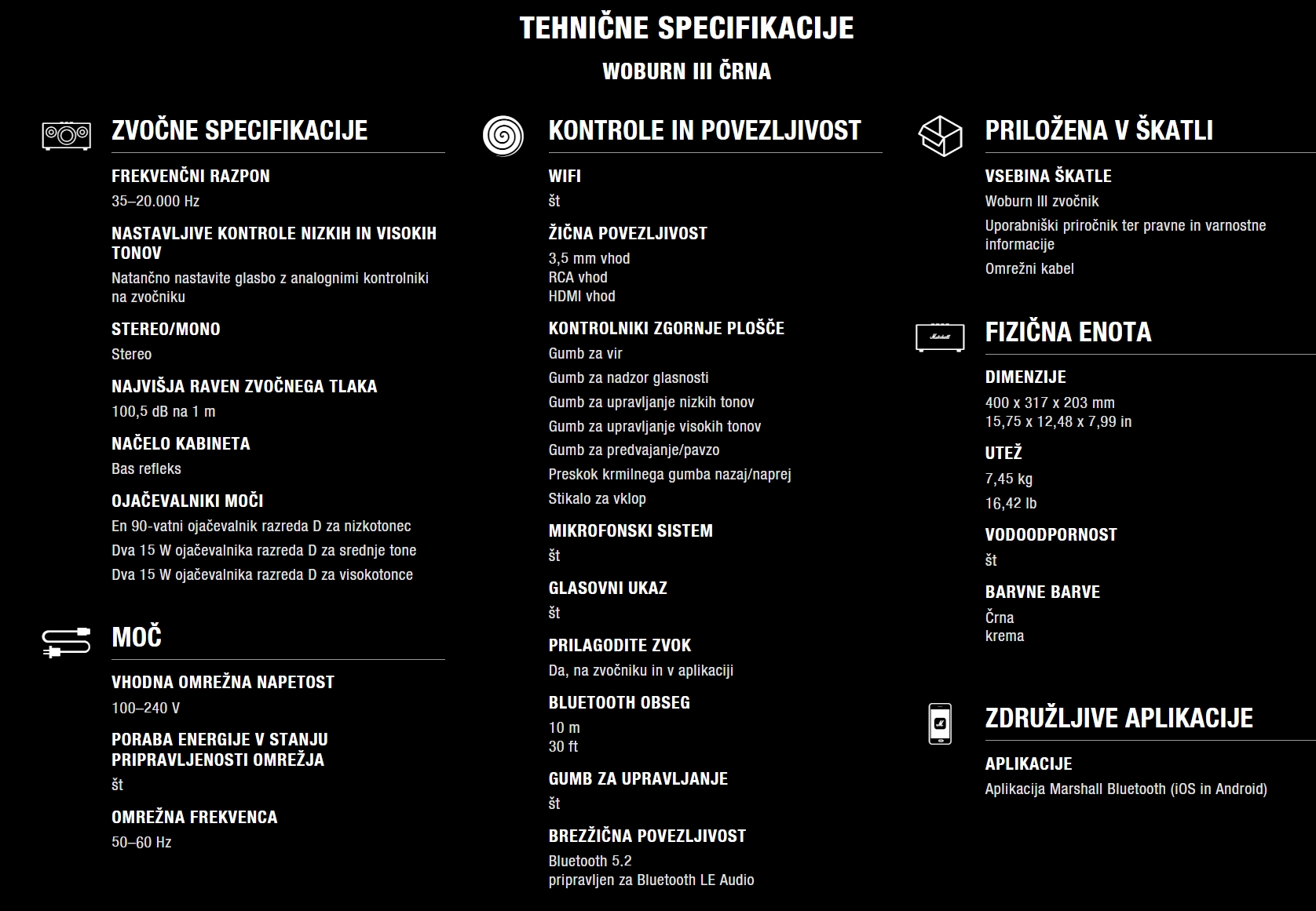 Woburn III bo zagotovo napolnil vsak prostor s presunljivim Marshallovim značilnim zvokom. Vgrajena funkcija Dynamic Loudness prilagaja tonsko ravnovesje zvoka, tako da glasba zveni odlično pri vsaki glasnosti. Woburn III je pripravljen na prihodnost tehnologije Bluetooth in je bil izdelan tako, da bo lahko zagotavljal funkcije Bluetooth naslednje generacije takoj, ko bodo na voljo.