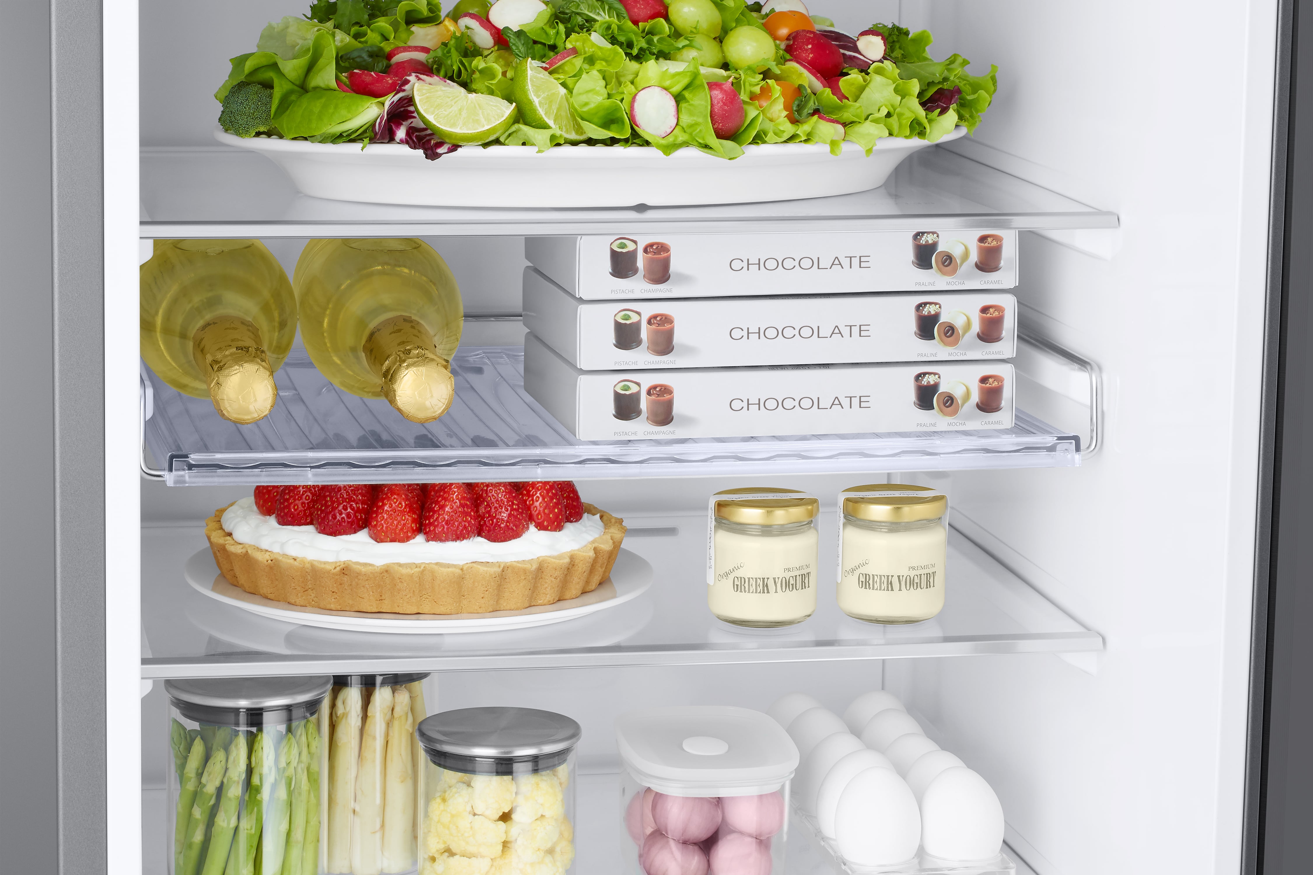 Izjemno velik 385-litrski hladilnik s standardno globino 600 mm zagotavlja več prostora za shranjevanje živil in se brezhibno poravna z vašimi omaricami.