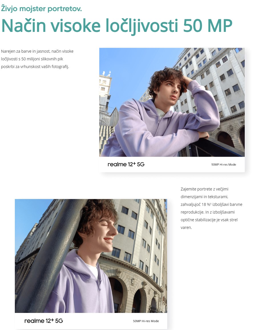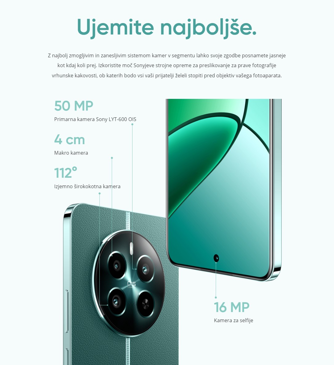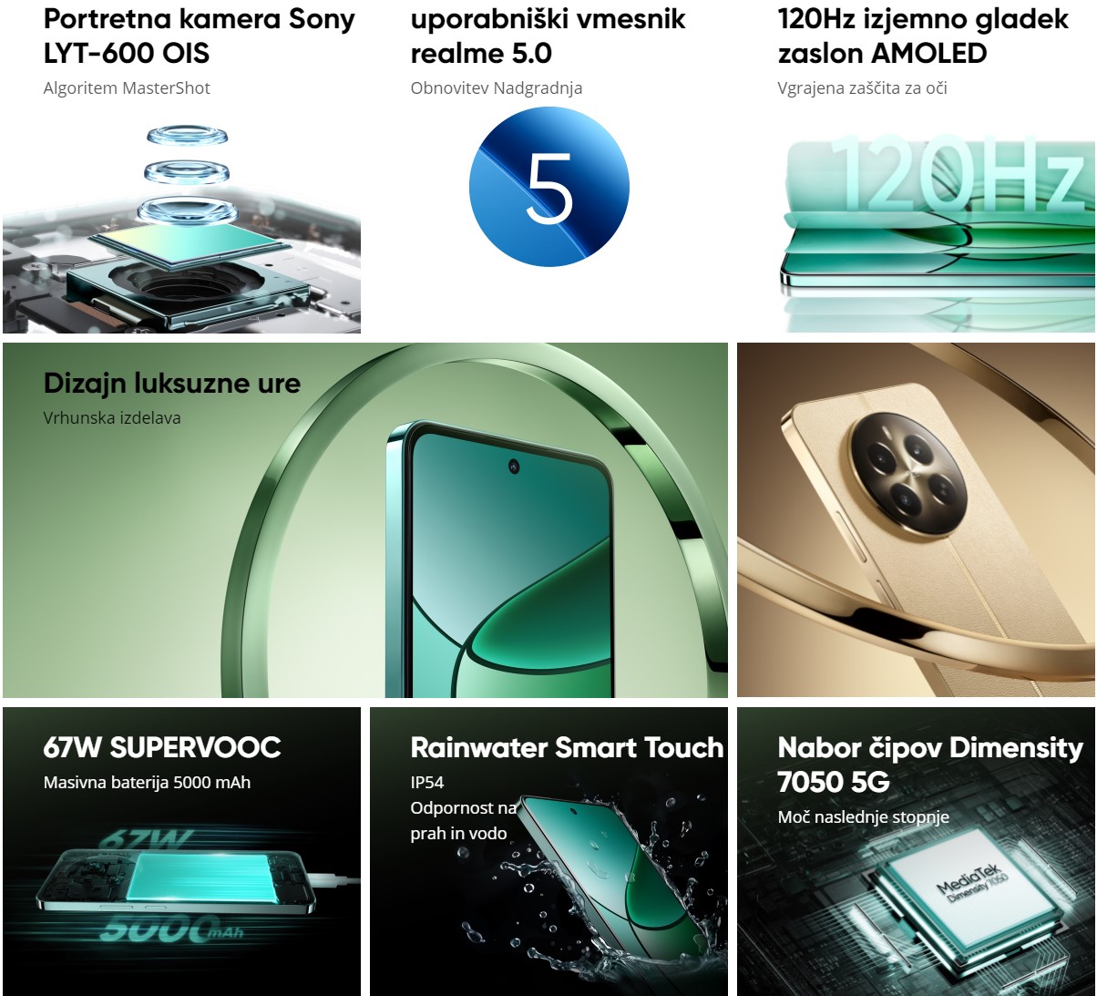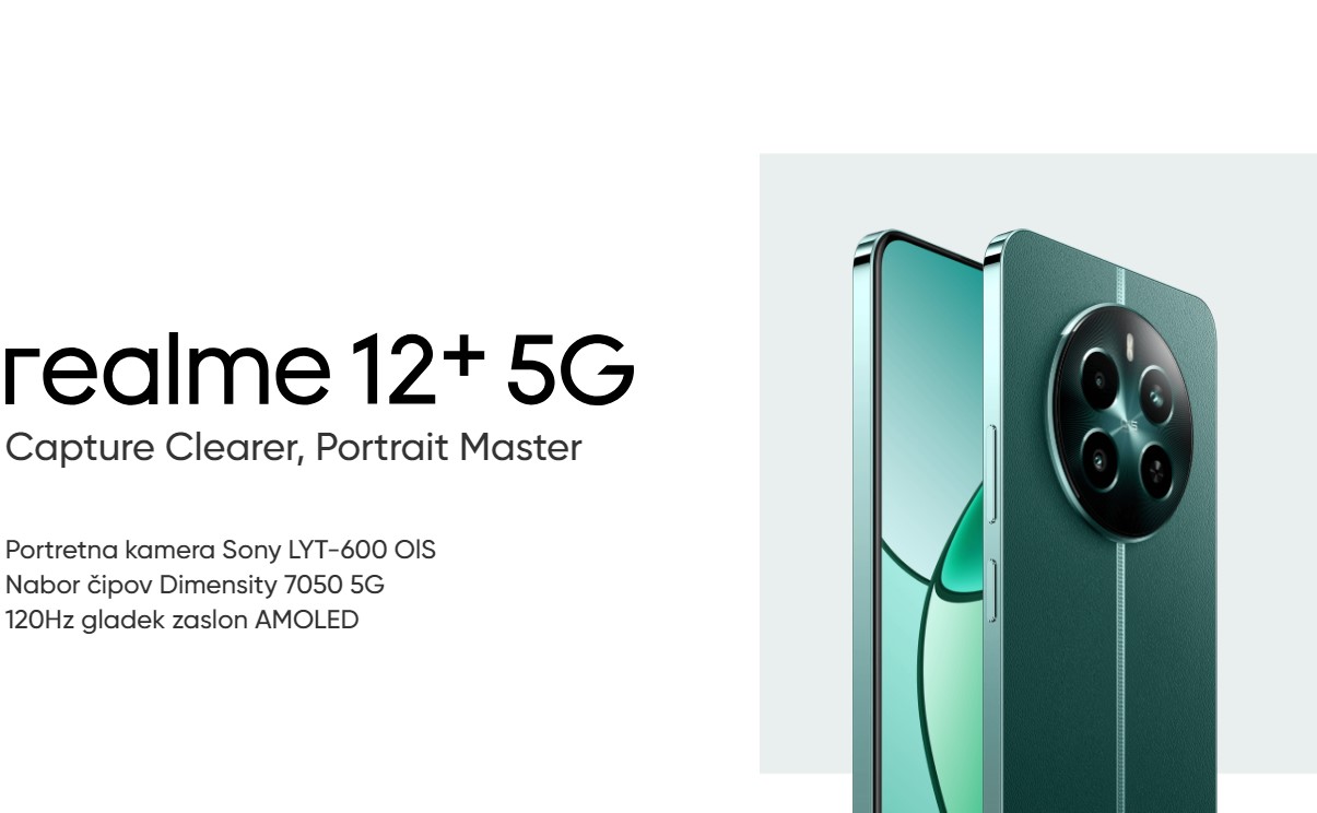 Realme 12+ ima 6,7-palčni AMOLED zaslon s 120Hz osveževanjem, MediaTek Dimensity 1080 čip, 8 GB RAM-a, 256 GB pomnilnika, 108 MP trojno kamero, 16 MP selfie kamero, 5000 mAh baterijo s 67W hitrim polnjenjem, ter deluje na Android 13 z realme UI 4.0. Podpira 5G povezljivost.