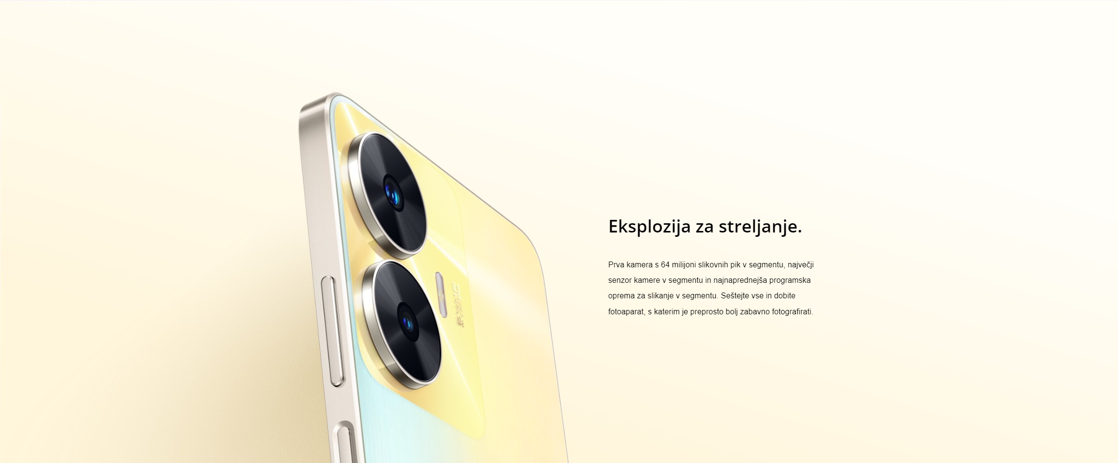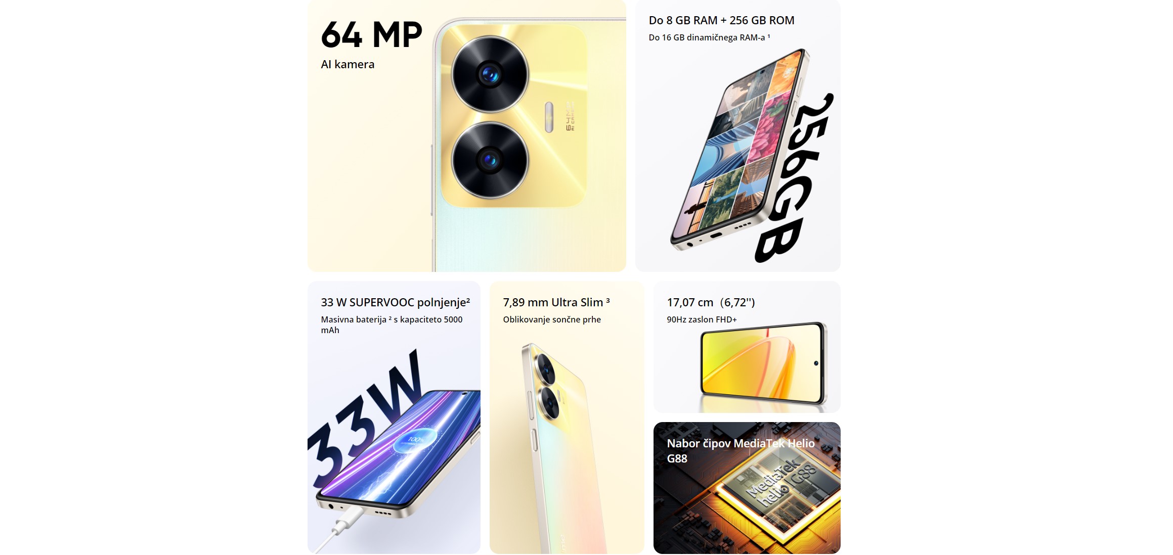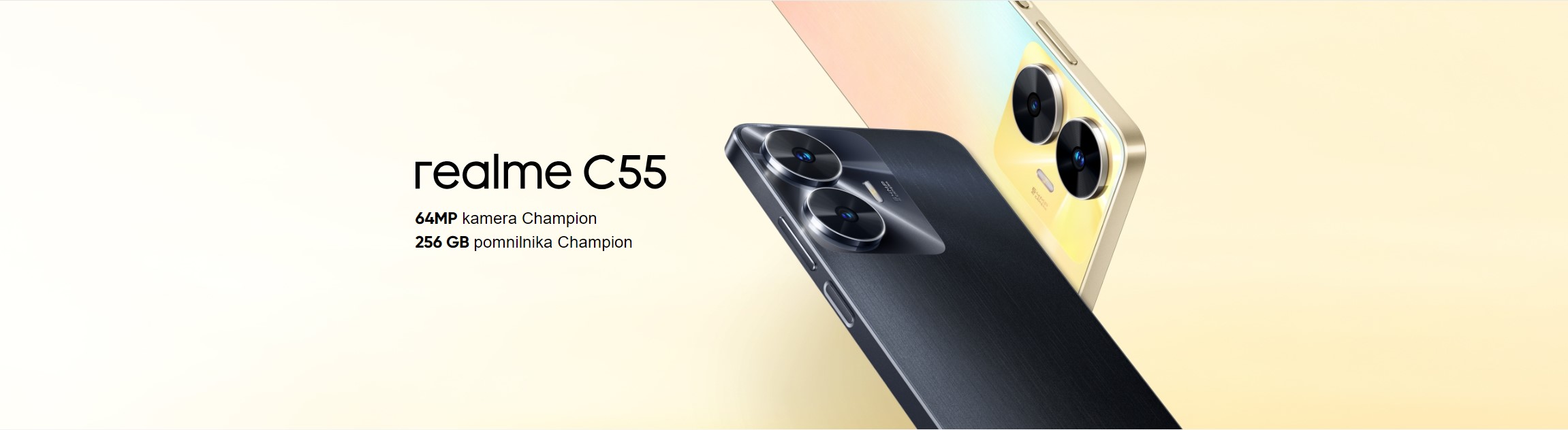 Realme C55 je zmogljiv pametni telefon, opremljen z 64 MP AI kamero, do 8 GB RAM-a in 256 GB notranjega pomnilnika, ter podporo za dodatnih 1 TB zunanje shrambe. S poudarkom na oblikovanju in zmogljivosti, telefon vključuje tudi 33 W SUPERVOOC polnjenje, masivno baterijo s kapaciteto 5000 mAh, ter 6,72-palčni zaslon FHD+ z 90 Hz osveževanjem. S sistemom Android 13 in realme 4.0 uporabniškim vmesnikom ponuja odlično izkušnjo uporabe.