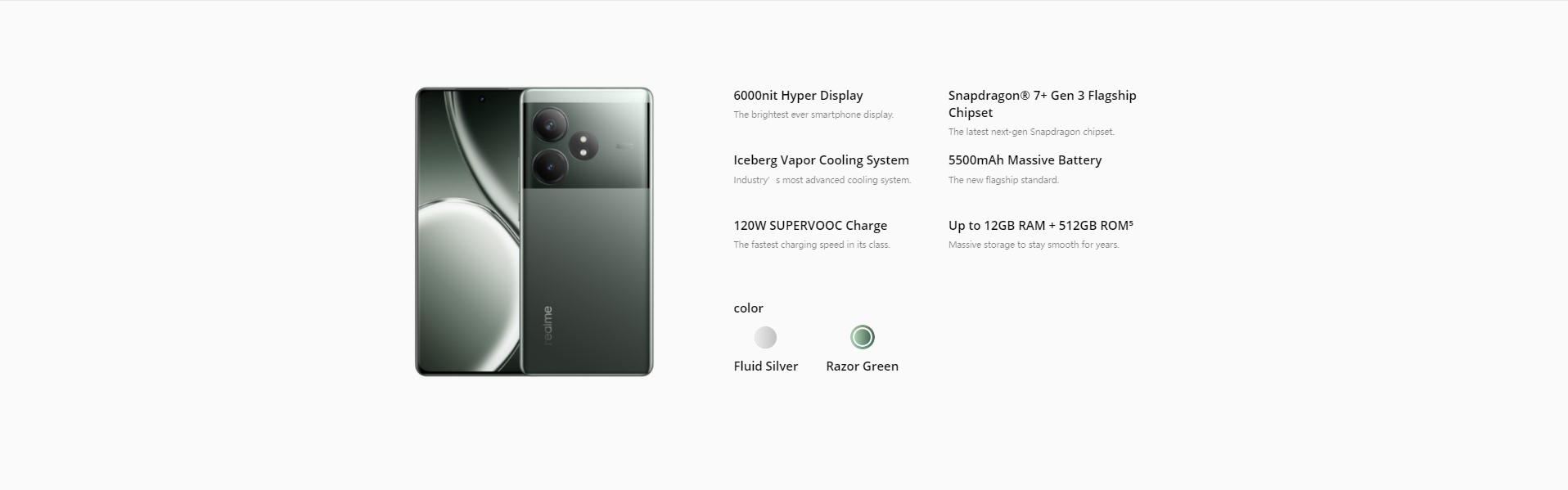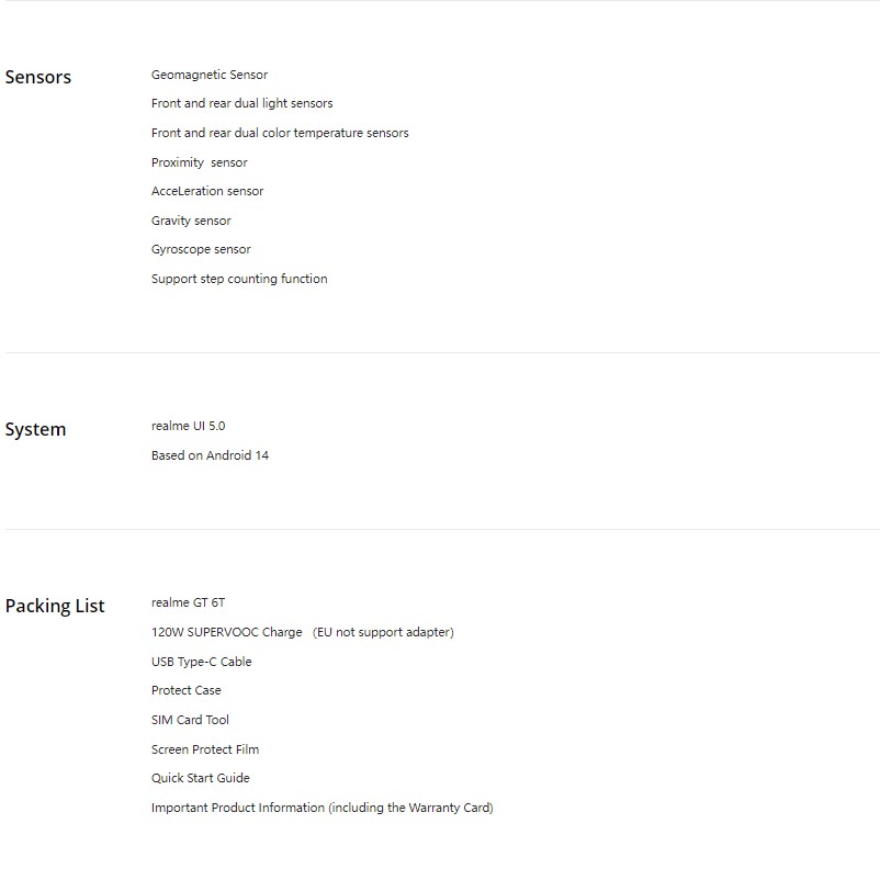 Realme GT 6T ima 6,78-palčni zaslon s 6000 niti, Snapdragon 7+ Gen 3 čip, 5500 mAh baterijo s 120W SUPERVOOC polnjenjem ter do 12 GB RAM-a in 512 GB prostora. Kamera vključuje 50 MP glavno kamero, 8 MP ultra širokokotno kamero in 32 MP sprednjo kamero. Ponuja podporo za 5G, Wi-Fi 6 in NFC ter deluje na Realme UI 5.0, ki temelji na Androidu 14. Dodatno vključuje napredno hlajenje in dvojne zvočnike.