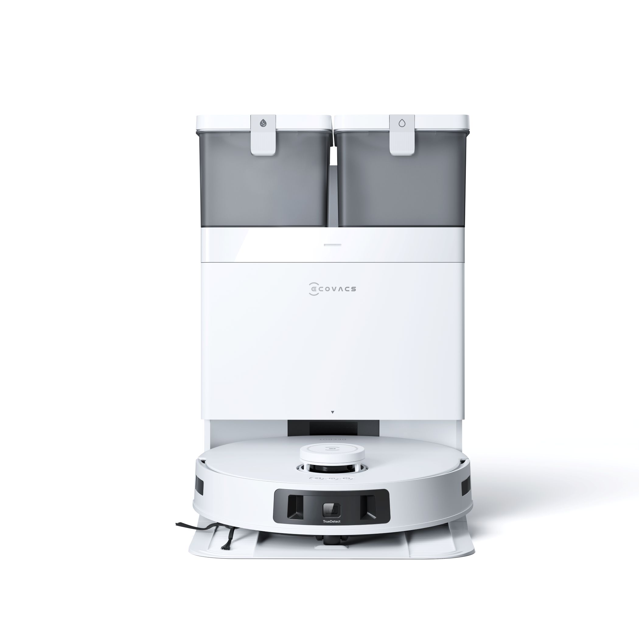 • Postaja vse-v-enem OMNI vrtljivi krpi opere z vodo pri 70°C in posuši s 45°C zrakom. Hkrati avtomatsko izprazni smeti iz koška robotskega sesalnika in rezervoar ponovno napolni z vodo.
