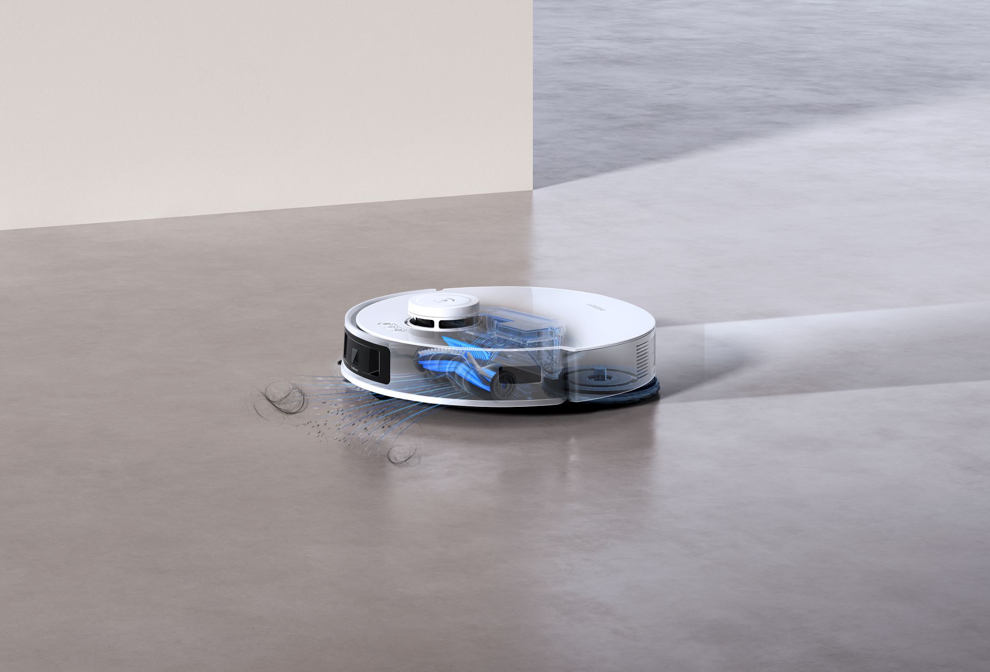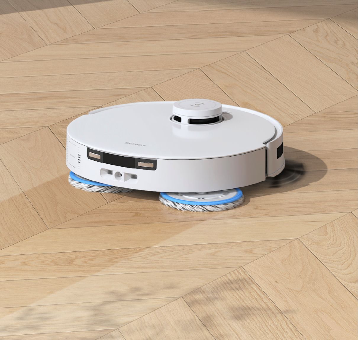 • Sistem dveh vrtljivih krp OZMO Turbo 2.0 iz ženiljske tkanine. Ko robot zazna preprogo, sistem za brisanje s samodejnim dvigom dvigne obe vrtljivi krpi do 9 mm.