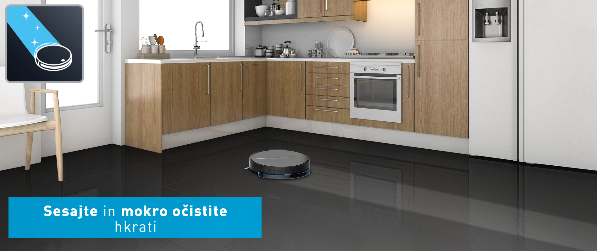 Robotski sesalnik, izboljšan s sistemom Aqua Force 4v1, čiščenje povzdigne na nov nivo, saj med sesanjem tla mokro obriše in odstrani najmanjše delce. 3 stopnje moči (Eco, Standard, Boost) na napravi, ki jo je izjemno enostavno uporabljati, za avtomatsko čiščenje brez primere.