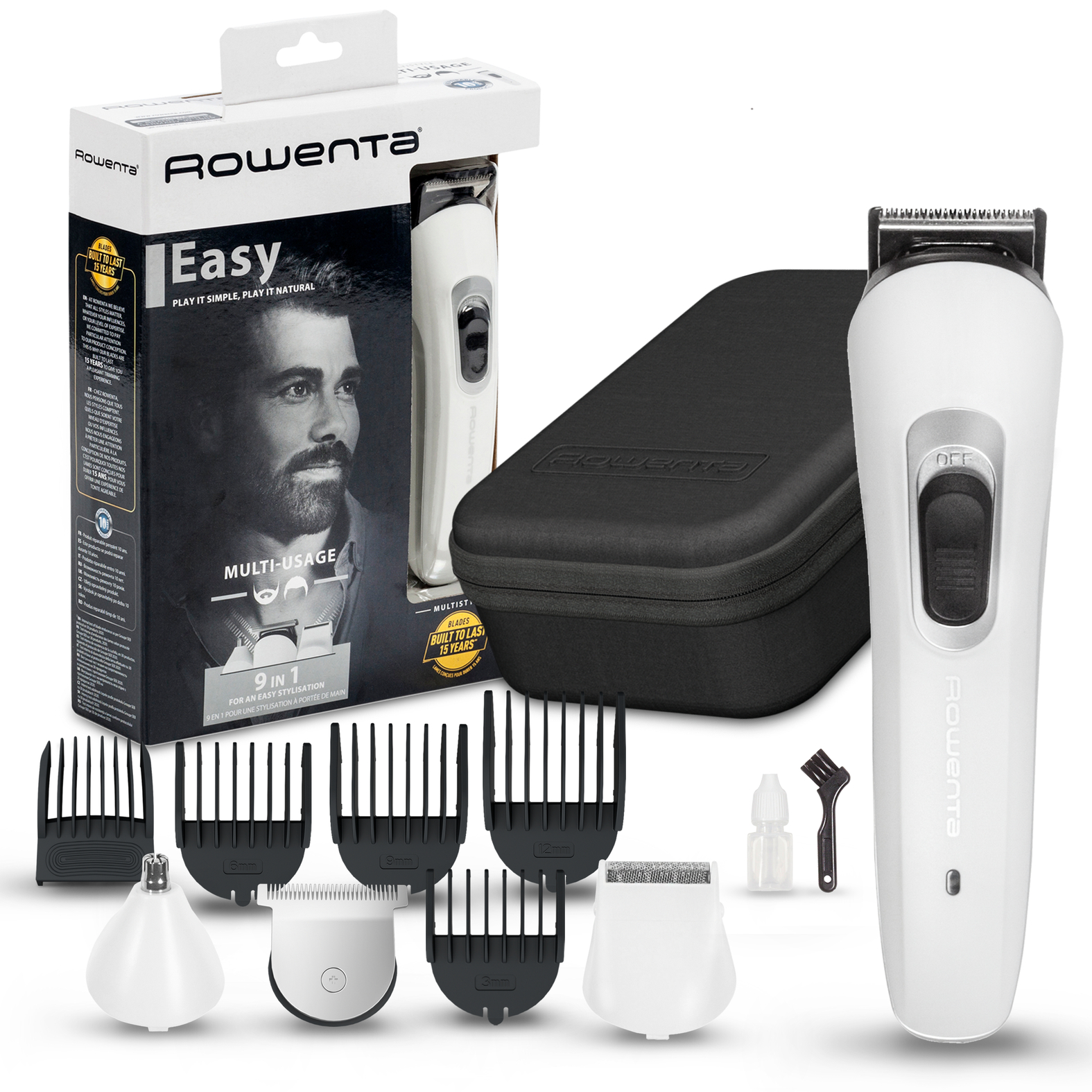 Strižnik Rowenta Multistyle je pravi odgovor za vse vaše potrebe pri striženju las in brade. Ta strižnik učinkovito postriže lase v eni potezi, rezultati pa so dolgotrajni zahvaljujoč izjemno hitremu motorju in rezilom iz nerjavnega jekla s tehnologijo samoostrenja. Večnamenski strižnik vključuje 44 mm rezilo za hitro in učinkovito striženje ter 4 fiksne glavnike za personaliziran slog, posebno 32 mm rezilo za brado z nastavljivim glavnikom za brado in poseben natančen brivnik za čiste robove na bradi. Poleg tega pa ima strižnik še vrtljivo rezilo za neboleče striženje neprijetnih dlak v nosu in ušesih. Zahvaljujoč 60-minutni avtonomiji je izjemno priročen.