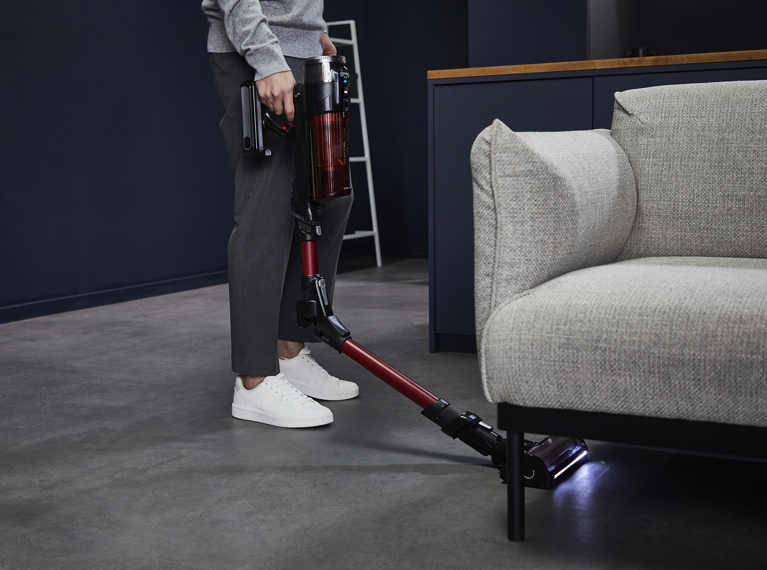 DOSEZITE NEDOSTOPNO: Zasnova s fleksibilno cevjo sega globoko pod pohištvo za popolno čiščenje povsod brez sklanjanja, z LED-osvetlitvijo za sledenje prahu v slabo osvetljenih prostorih