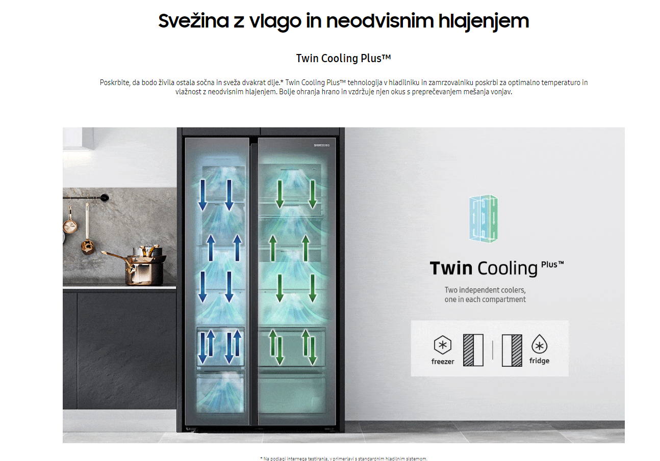 Ta hladilnik je opremljen z različnimi funkcijami hlajenja, kot so No Frost, Multi Flow, Power Cool in Power Freeze, ki zagotavljajo optimalno temperaturo in zračenje za vaša živila. Twin Cooling Plus tehnologija ohranja vaša živila sveža dlje časa.