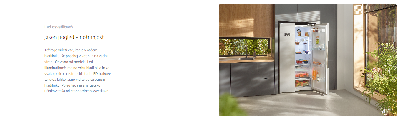 Z LED osvetlitvijo boste imeli jasen pogled v notranjost hladilnika, kar olajša iskanje živil tudi v kotih in na zadnji strani. LED osvetlitev je energetsko učinkovita in zagotavlja enakomerno osvetlitev celotnega prostora.