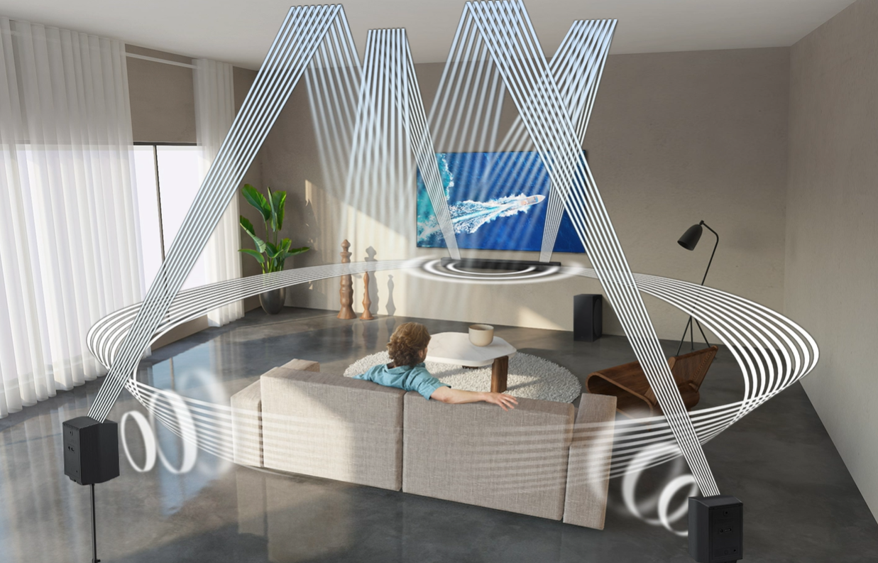 9 sprednjih in prostorskih kanalov zvočniške vrstice, 1 kanal za nizkotonski zvočnik in 4 kanali za pospeševanje zvoka vas ovijejo v zvok. Z novo dodanimi zadnjimi zvočniki zvok potuje in se odbija od stropa, da izboljša vašo izkušnjo prostorskega zvoka – odlično se ujema z vašim televizorjem QLED.