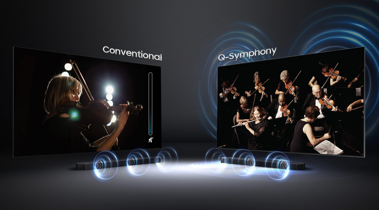* Q-Symphony je združljiv z izbranimi televizorji Samsung.* Funkcije morda niso združljive z vsemi televizorji Samsung. Preverite specifikacije izdelka glede na model televizorja.* Funkcija zahteva HDMI, optično ali Wi-Fi povezavo s televizorjem.