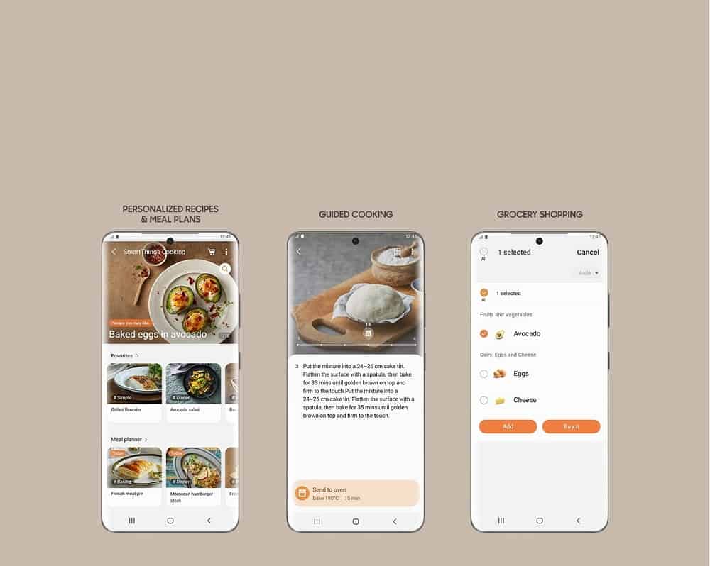 Naj vaša izkušnja kuhanja postane bolj zabavna. SmartThings Cooking* prihrani čas in kar se da zmanjša breme kuhanja. Z razumevanjem vaših potreb priporoča personalizirane recepte** in ustvarja tedenske načrte obrokov. Ponuja tudi vodeno izkušnjo kuhanja in omogoča enostavno nakupovanje živil.***