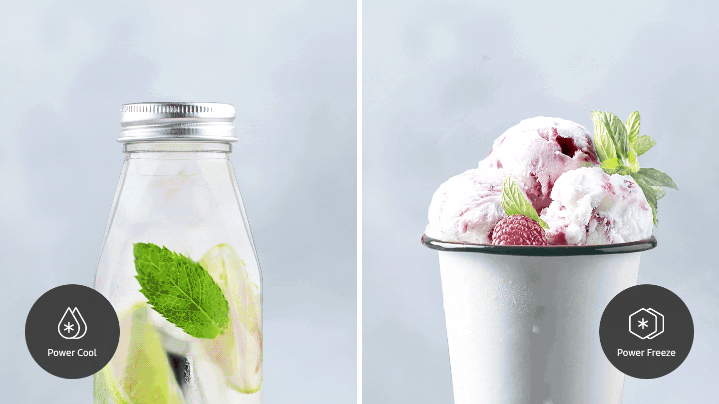 Izkoristite zmogljivost hitrega hlajenja. Ob dotiku gumba začne funkcija Power Cool pihati zelo ohlajen zrak v hladilnik in tako hitro ohladi nova živila ali priljubljeno pijačo. Medtem funkcija Power Freeze poskrbi za hiter dotok mrzlega zraka v zamrzovalnik. To je priročno zlasti pri zamrzovanju ali strjevanju zamrznjenih živil in za pripravo ledu.