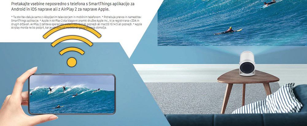 retakajte vsebine neposredno s telefona s SmartThings aplikacijo za Android in iOS naprave ali z AirPlay 2 za naprave Apple.