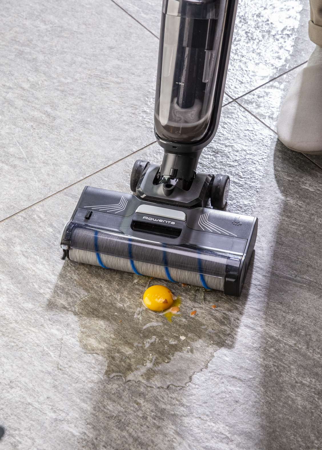 KAJ JE V ŠKATLI: Brezžični sesalnik za hkratno sesanje in mokro čiščenje, dodatna mehka krtača iz mikrovlaken, stranska krtača, suhi in penasti filtri proti trkom, polnilnik, polnilni in čistilni podstavek, čistilna krtača