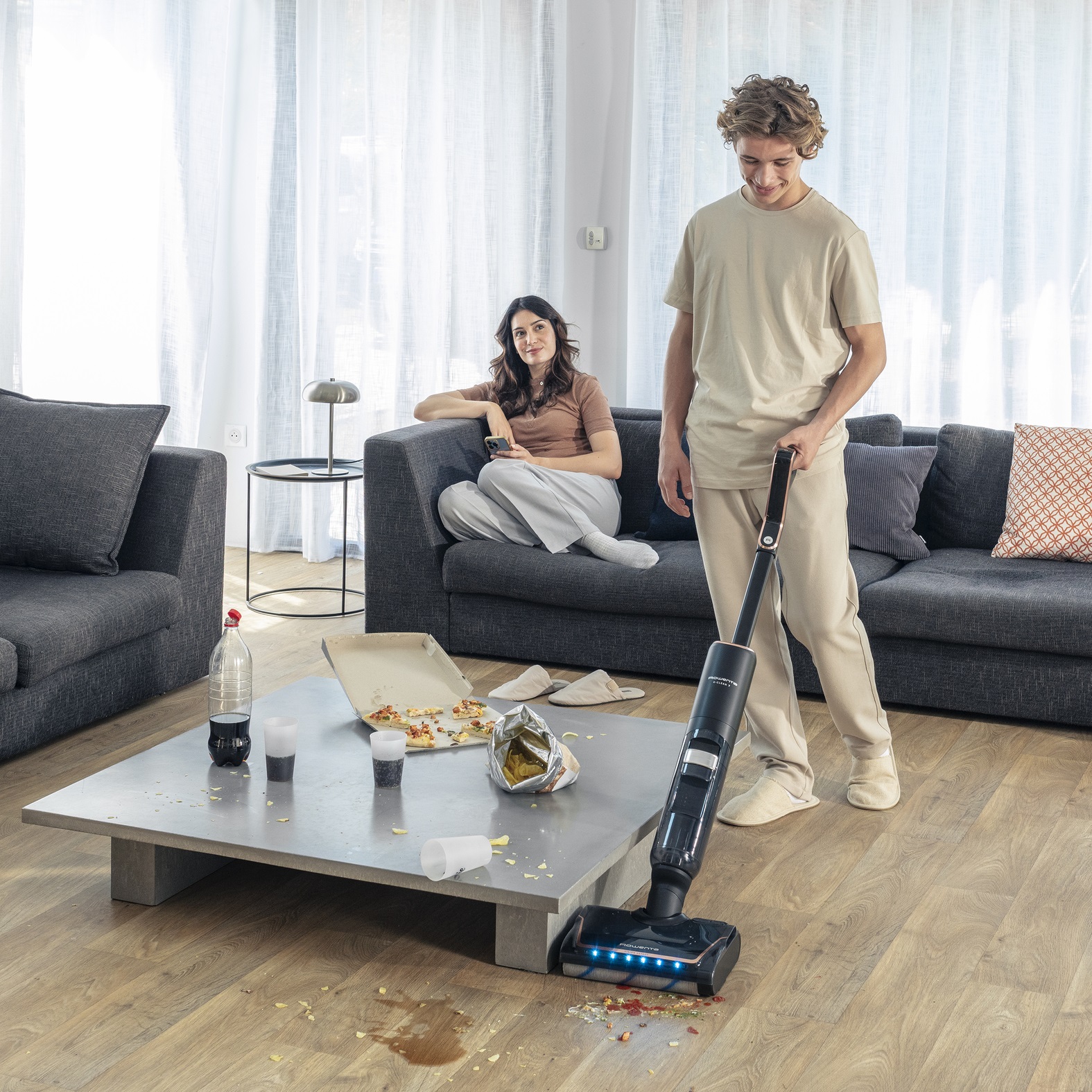 Rowenta X-Clean 7, sesalnik za mokro in suho sesanje, 180° ploska zasnova, samodejno čiščenje, GZ5736E0 UČINKOVITO ČIŠČENJE 2 V 1: Spoprijemajte se z vsako mokro in suho umazanijo – z načinom samodejnega zaznavanja umazanije in valjem, ki vedno čisti s svežo vodo. ČISTO POVSOD: 180° ravna zasnova za čiščenje pod pohištvom, z LED-diodami za osvetlitev skrite umazanije in tanko krtačo za brezhibno čiščenje ob stenah. POENOSTAVLJENO VZDRŽEVANJE: 180-sekundni cikel samočiščenja s svežo vodo in neposrednim sušenjem z vročim zrakom do 60 °C z enim samim klikom, da se izognete morebitnim neprijetnim vonjavam. ČIŠČENJE BREZ NAPORA: Samohodni sistem z valji ponuja ultra lahko napravo, ki v roki tehta le 0,9 kg. 15-LETNA POPRAVLJIVOST PO POŠTENI CENI: Priporočamo, da izdelek popravite v naši mreži 6200 servisnih centrov po vsem svetu, da bo deloval dlje. DOLG ČAS DELOVANJA: Do 50 minut delovanja* za celotno hišo, z velikim 650-ml rezervoarjem za vodo za čiščenje brez prekinitev. INTUITIVNO IN POPOLNO VODENJE: Izkušnja brez težav z glasovno pomočjo in informacijami, ki se v realnem času prikazujejo na velikem LED-zaslonu. SISTEM PROTI ZAPLETANJU: Kovinski glavnik s 164 zobmi krtači lase in živalsko dlako, da se prepreči zapletanje okoli krtače za lažje vzdrževanje. RAZKUŽEVANJE: Z združljivimi detergenti za čiščenje za razkuževanje za višjo raven čiščenja.