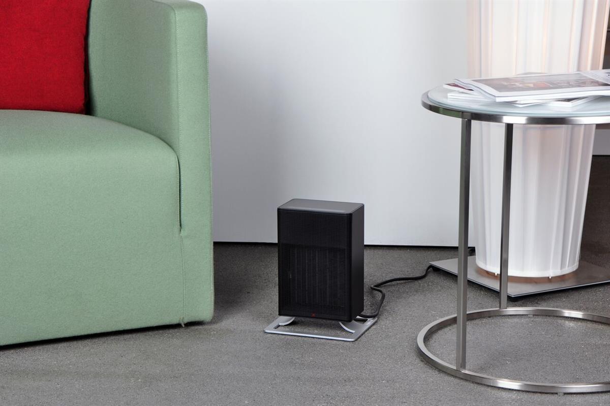 Ventilatorski grelnik prostora , ki ima elegantno ozko ohišje. Njegov sistem delovanja: PTC keramični grelni element (samoregulirna keramika). Je črne barve.