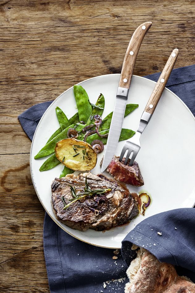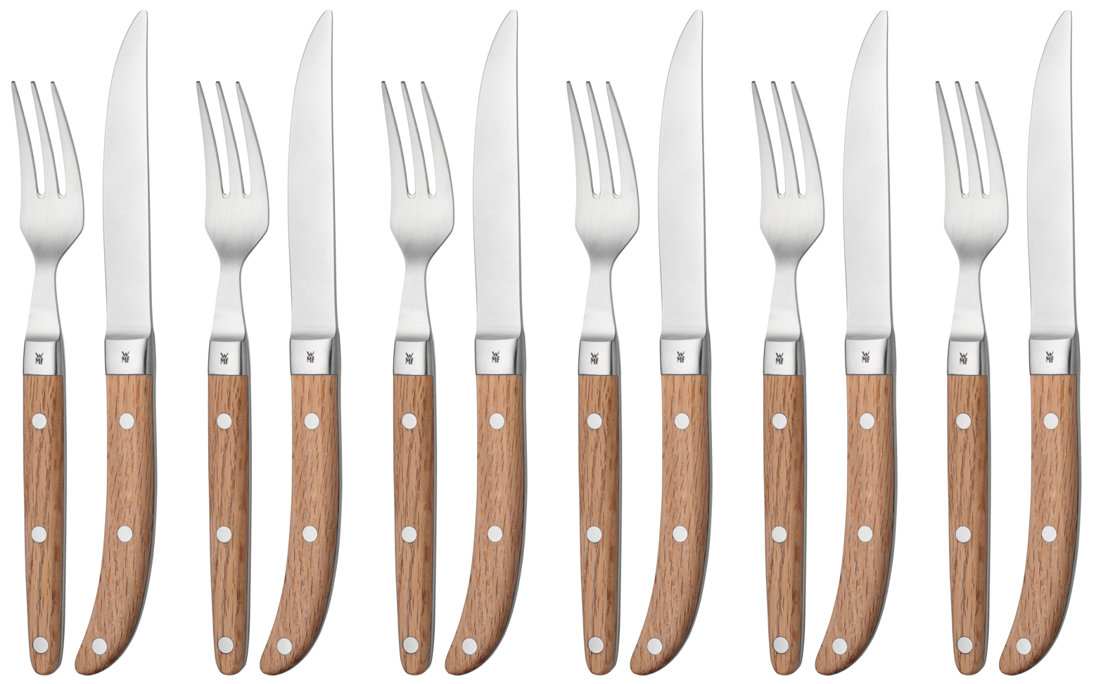 - Pribor WMF Ranch Steak Cutlery: Vsebina: rustikalna kombinacija lesa in mat nerjavečega jekla: 6x nož za steak (24 cm) in 6x vilice za steak (21 cm)