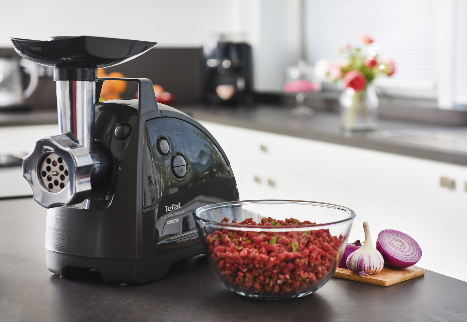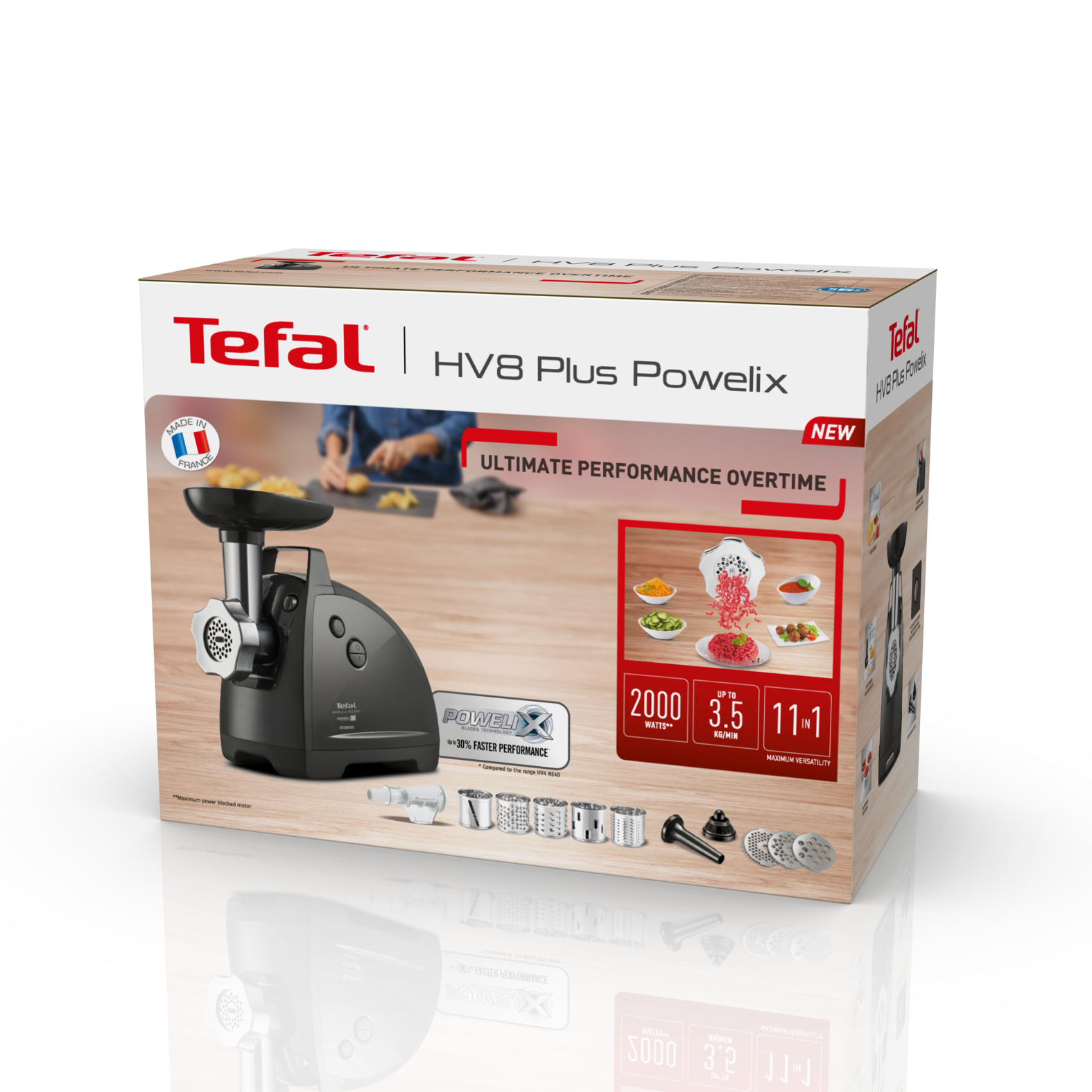 Aparat za mletje mesa Tefal NE685838 »HV8 Plus 11v1« popolno in hitro mletje za meso. Aparat za mletje mesa nudi najboljše zmogljivosti z vsestranskimi možnostmi. Tefal HV8 je izjemno zmogljiv (2000 W) vsestranski mlinček za meso, ki ga lahko zahvaljujoč vsestranskim funkcijam uporabite za pripravo mesnih kroglic, kotlet, klobas in prilog. Prihranite čas v kuhinji s priročnimi dodatki za stranske jedi in solate. Mlin za meso lahko zahvaljujoč 2000 W motorne moči predela do 2,6 kg mesa na minuto. Ta mlinček za meso je na voljo s petimi nastavki: za hitro mletje in rezanje zelenjave, sira ali čokolade in nastavek za pripravo klobas in hrenovk. Mlinček za meso ima izredno varen sistem za obratno smer vrtenja: smeri ni mogoče naključno nastaviti, zato je motor zaščiten pred obrabo. Zahvaljujoč trem rešetkam je fino, srednje in grobo mleto. Zahvaljujoč integriranemu prostoru za shranjevanje pripomočkov in kabla neposredno na mlinčku omogoča, da vsi deli ostanejo skupaj. To bo olajšalo pospravljanje, pa tudi uporabo. Praktični ročaj za priročno prenašanje.