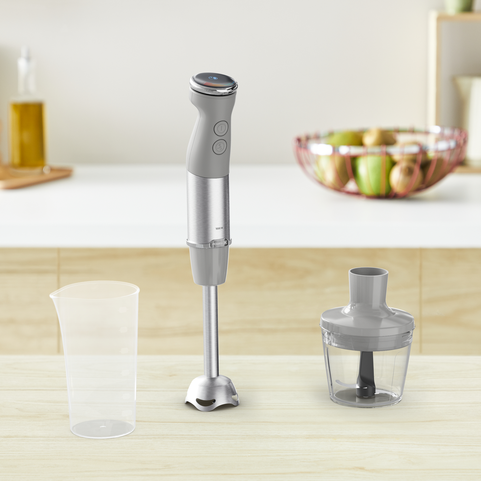 IZJEMNA MOČ MEŠANJA: visoko zmogljiv palični mešalnik z močjo 1000 W, opremljen s tehnologijo rezil Powelix za neverjetno gladkost in do 30 % hitrejše rezultate* (*v primerjavi z našo klasično tehnologijo z 2 reziloma)