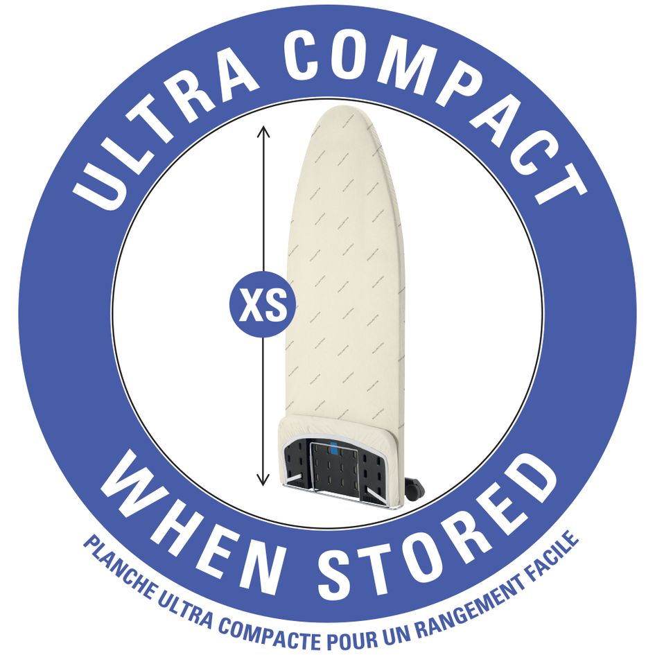 Kompaktna likalna deska Pro Compact s kovinsko mrežo in nogicami z nastavljivo višino in obešalnikom. Dodana je prevleka iz debelega bombaža in pene.