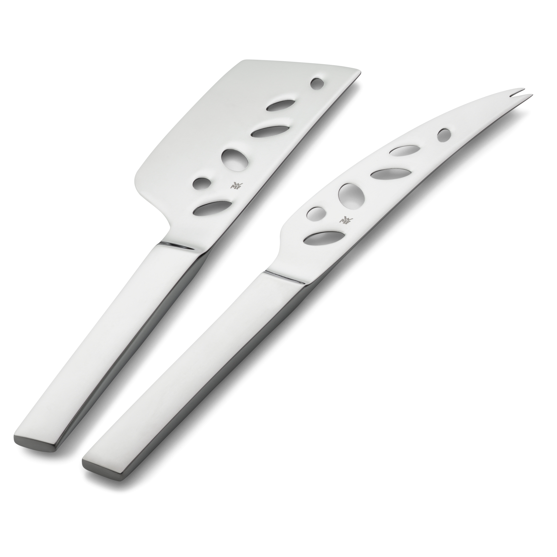 2-delni set nožev za sir WMF, dolžine 24-27,5 cm. Luknje v nožu za sira preprečujejo, da bi se mehki sir, kot so Brie, Camembert in zrel Gorgonzola, zataknil na lopatki. Z ostrim in visokim rezilom, ki je z obeh strani brušeno, so možni gladki in ravni rezi.