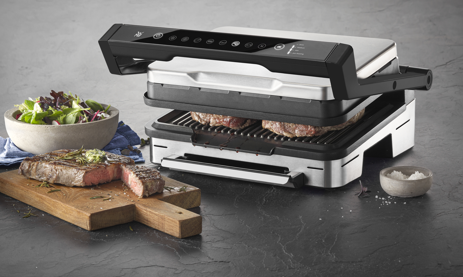 WMF Profi Plus Contact Grill Perfection ponuja izjemno kontaktno peko na žaru s samodejno senzorsko tehnologijo in celotnim naborom praktičnih funkcij, s katerimi dosežemo popolne rezultate na enostavni način.
