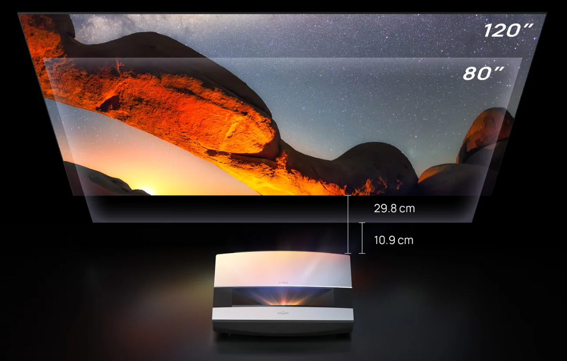 Opremljena z napredno tehnologijo Ultra Short Throw (UST), AURA zagotavlja dih jemajoče zaslone različnih velikosti brez ogrožanja prostora. Postavite AURA 11,7" od katere koli stene in uživajte v 120" kot britev ostrih slikah za vse, kar gledate.