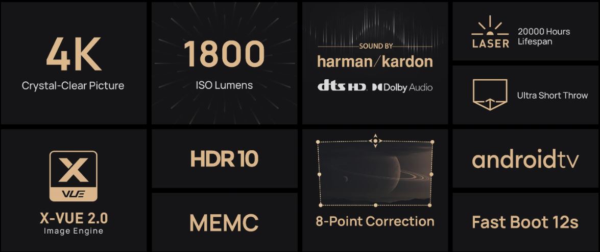 Resnični 4K UHD z 8,3 milijona posameznih slikovnih pik na zaslonu, tehnologija ALPD in HDR10 so čudovito združeni, da zagotovijo osupljivo jasne slike in žive, realistične barve, za katere se zdi, da skočijo iz zaslona. Z AURO si boste vsak film ogledali tako, kot si je zamislil režiser.